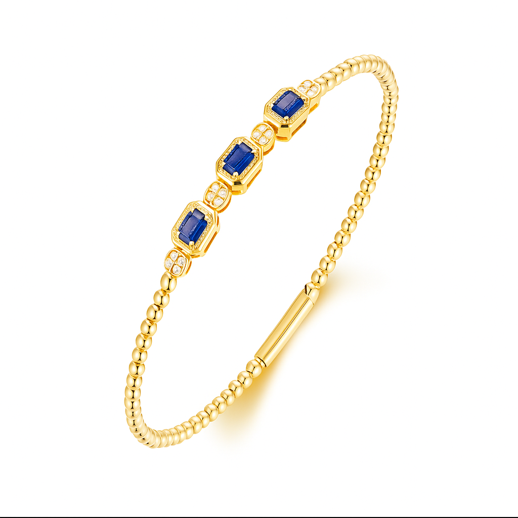 Vibrant and refined, this 14K yellow gold bangle features three rich blue sapphires totaling .81 carats, accented by sparkling round diamonds totaling .10 carats. Each sapphire is elegantly framed in a geometric bezel design, enhanced by diamond details that add just the right touch of brilliance. The beaded gold band brings texture and warmth, giving this piece a modern yet timeless feel. Beautiful worn alone or stacked with other bangles, it’s a stunning expression of sophistication and color.