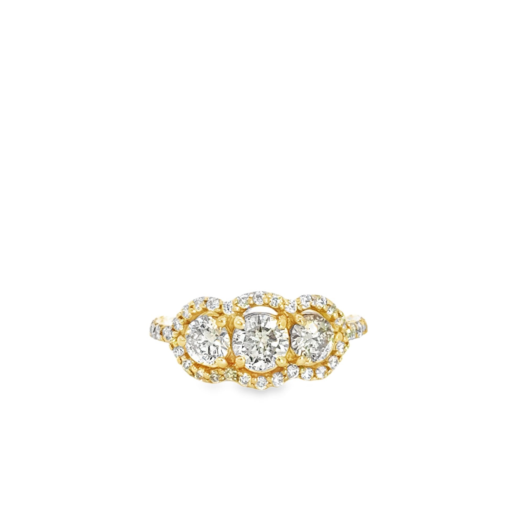 14K Yellow Gold Three-Stone Round Diamond Continuous Halo Ring
