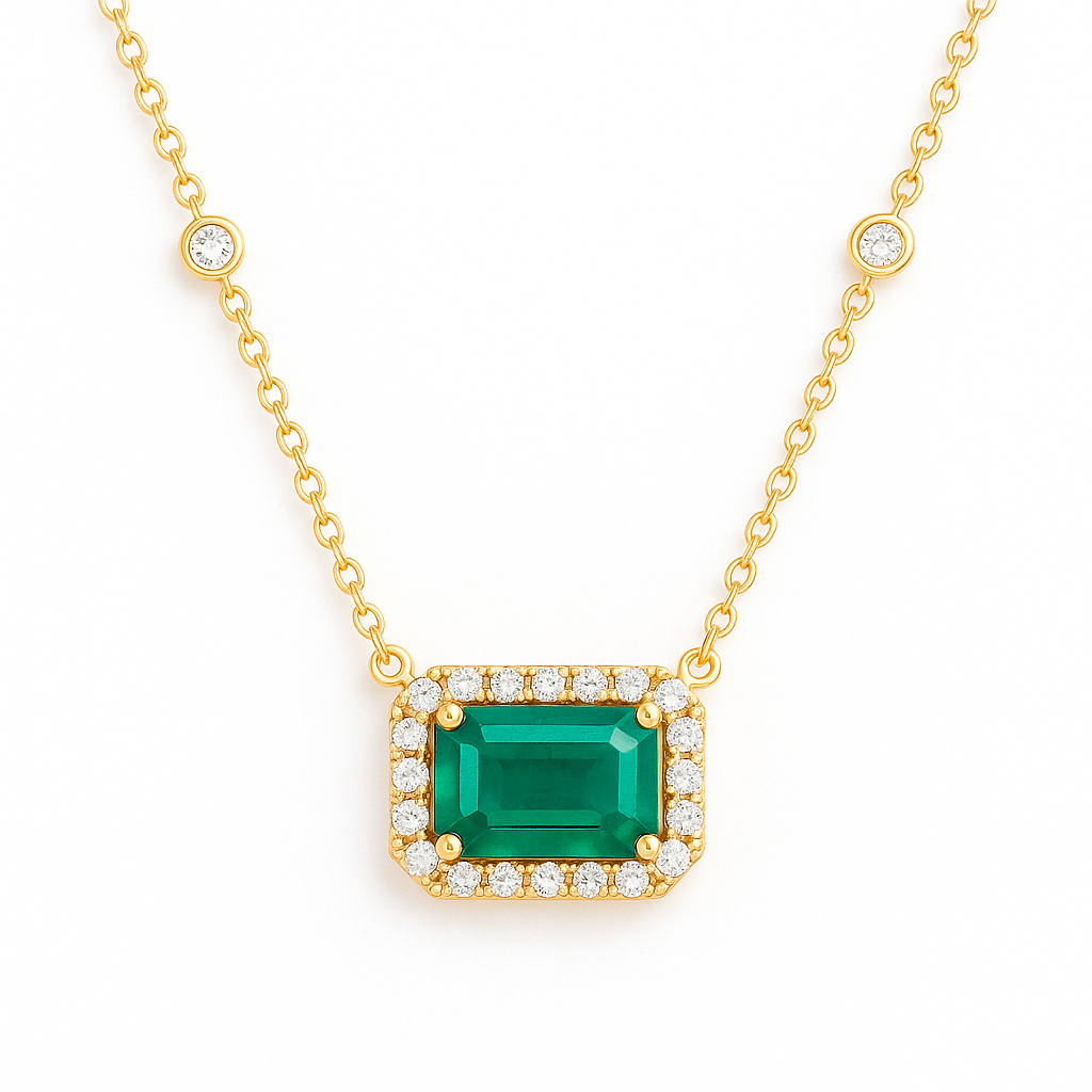 Vibrant, elegant, and beautifully detailed — this two-tone emerald necklace adds the perfect pop of color to any look. The centerpiece features a vivid .84ct emerald-cut emerald, showcased in a sleek bezel-inspired frame and surrounded by a shimmering halo of pavé diamonds totaling .22ctw. The contrast of the rich green emerald against the warm 14KT yellow gold and bright white gold accents creates a striking, luxurious finish.