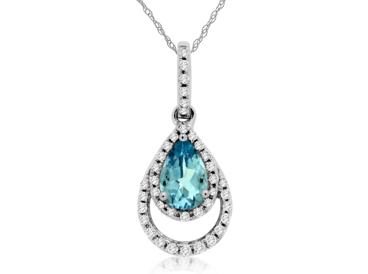 A .35ct pear shaped aquamarine is the striking focal point of this stunning necklace. The gemstone is set on a polished 14k white gold chain and is upgraded with a double halo of shimmering diamonds (0.11ctw).