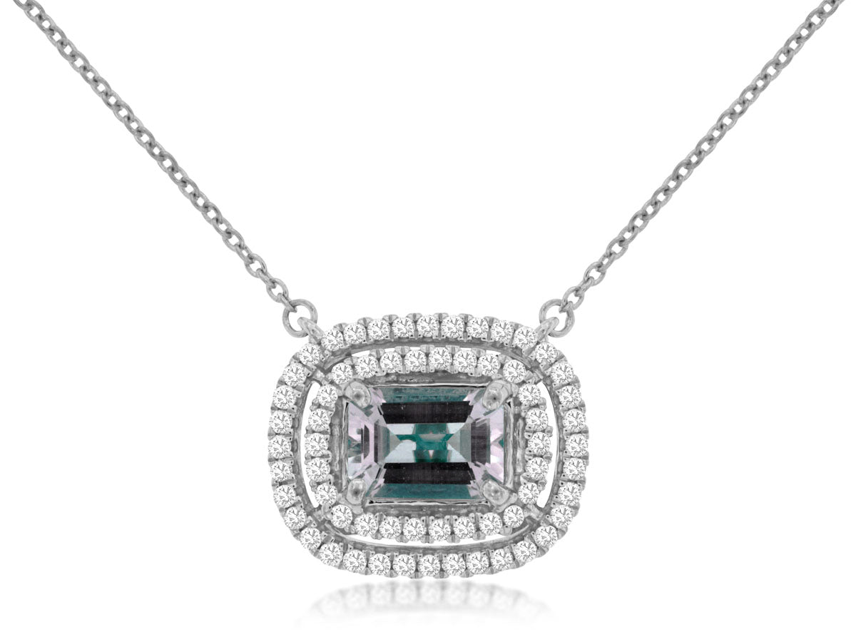 A .85ct emerald cut aquamarine is the striking focal point of this stunning necklace. The gemstone is set on a polished 14k white gold chain and is upgraded with a double halo of shimmering diamonds (0.33ctw).