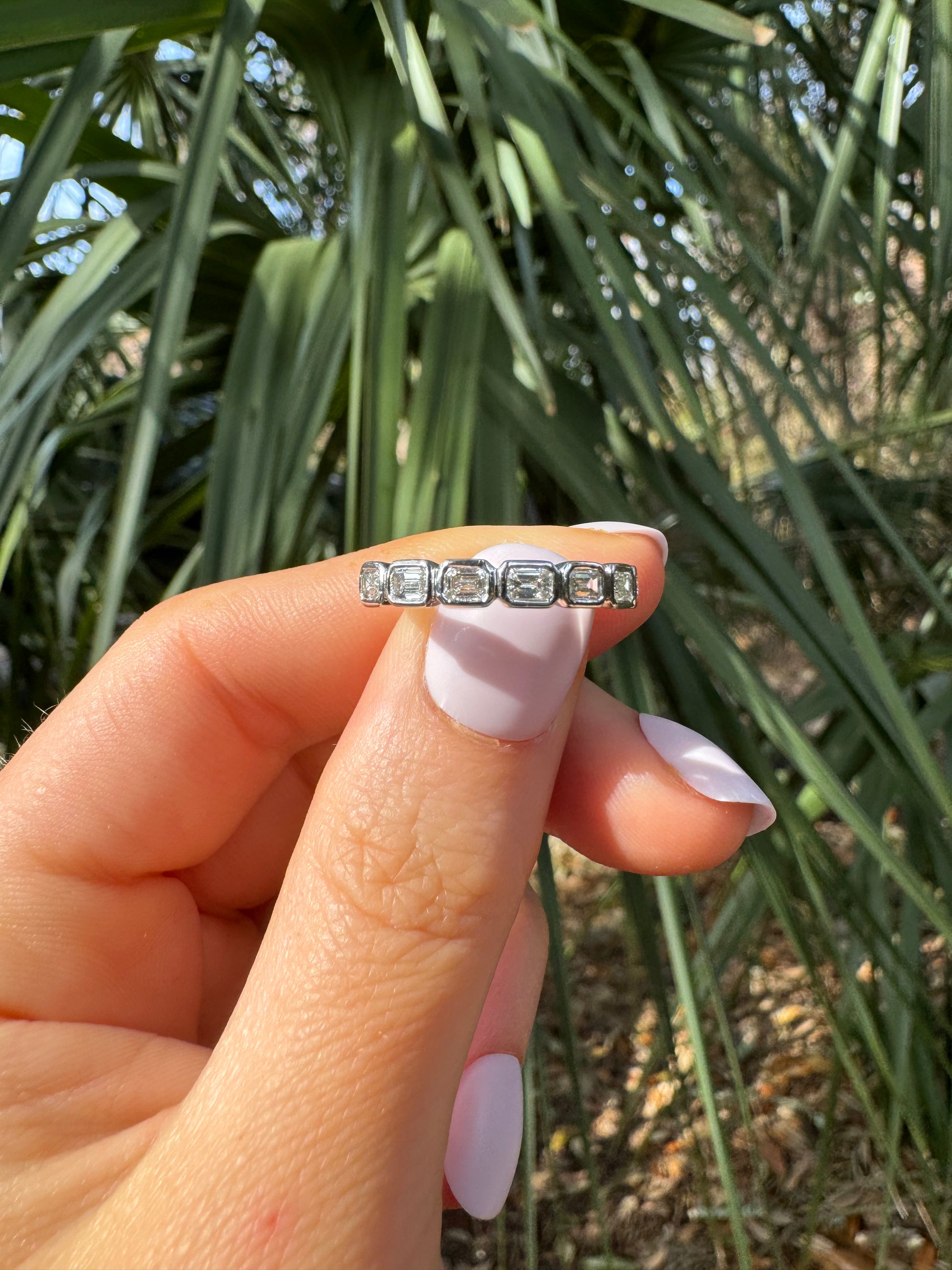 Seven baguettes are set east to west in white gold bezels (0.65ctw)
