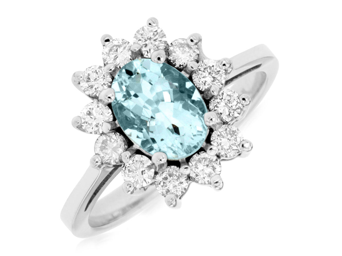 A 1.10ct oval aquamarine is the striking focal point of this commanding fashion ring. The March birthstone is set on a polished 14k white gold and diamond shank. This gemstone ring is enhanced with a sparkling diamond halo. Total diamond weight is .75cts