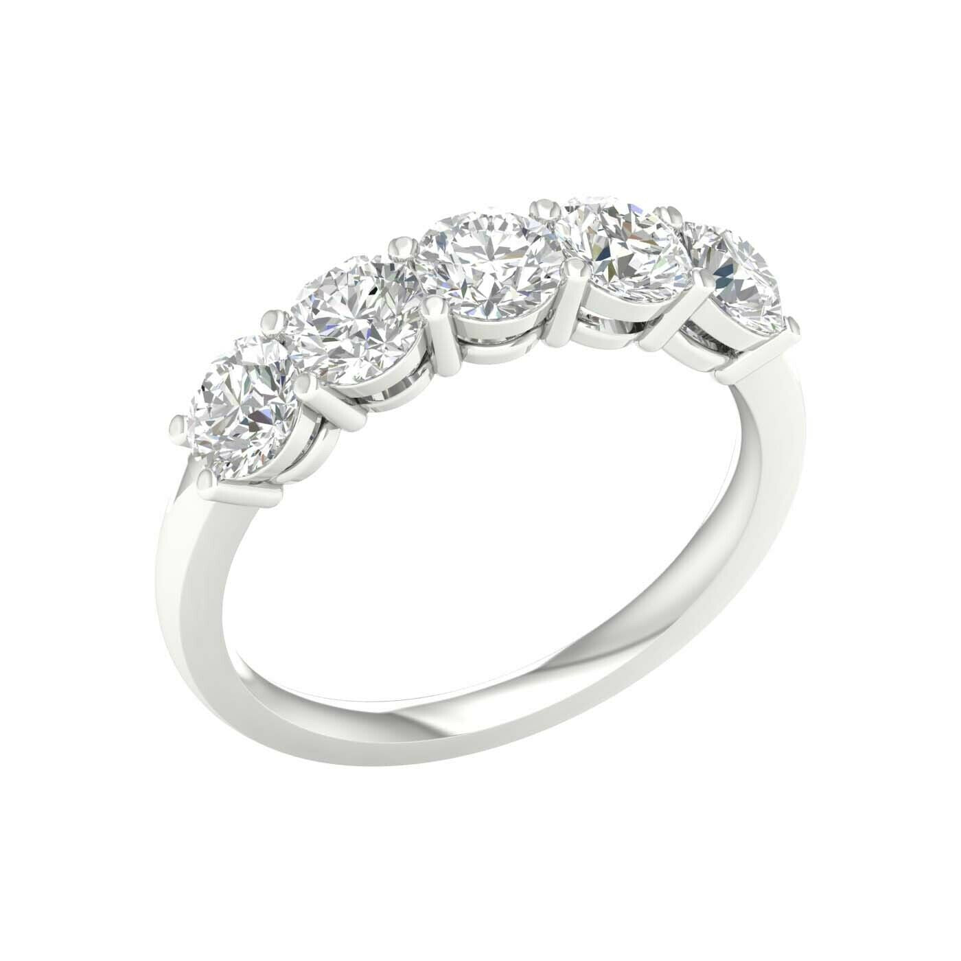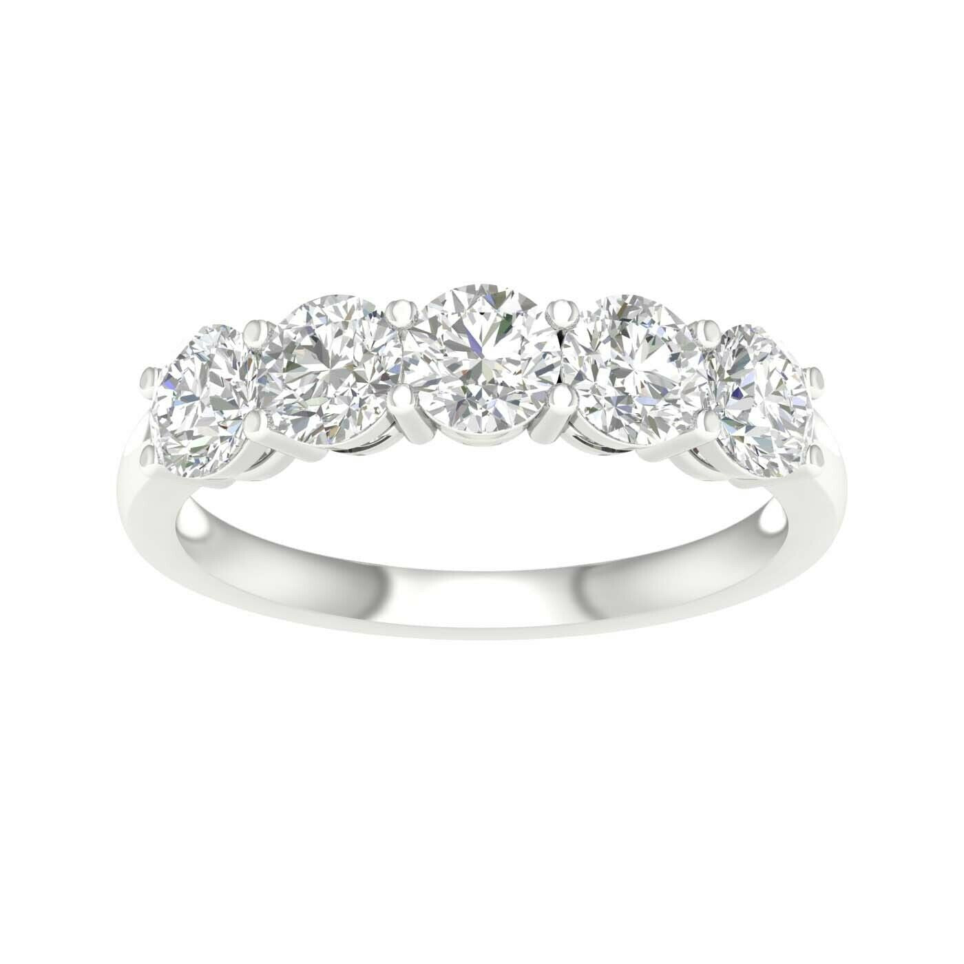 The brilliant round lab-created diamond 5-stone band, certified by IGI for quality assurance, is set in 14K white gold and studded with 1.50 ct. t.w. of diamonds in a timeless four-prong setting. Each round brilliant-cut diamond, weighing 1/3 ct.