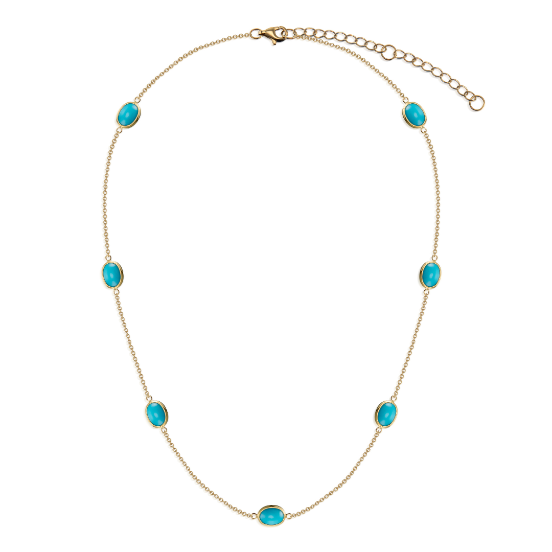 Effortlessly elegant and full of color, this 18K yellow gold necklace features seven oval turquoise gemstones totaling 4.70 carats. Each stone is bezel-set in polished gold, highlighting the vibrant blue hue and smooth texture of the natural turquoise. Perfectly balanced along a 16-inch chain, this necklace brings a touch of refined sophistication and playful charm — beautiful on its own or layered with other favorites for a modern, stacked look.