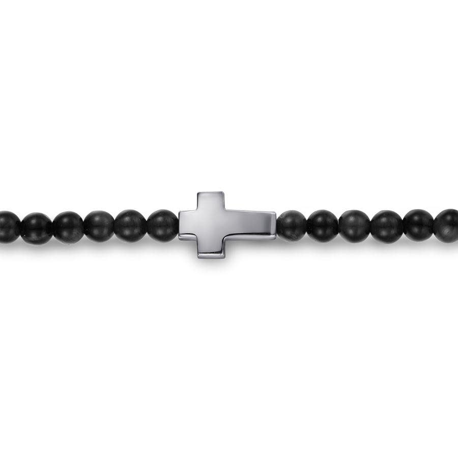 Faith is the focus of this beaded Bujukan bracelet for him. A polished 925 sterling silver cross is incorporated in an east-west orientation. Round onyx beads and textured metal spacers comprise the remainder of its length. Style and belief go hand-in-hand in this timeless beaded cross bracelet.