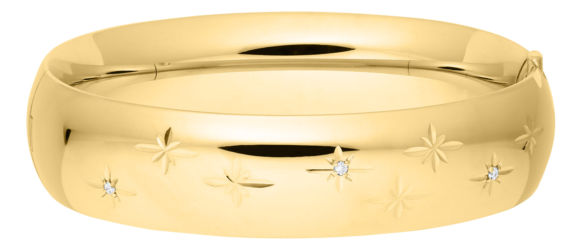 Mix and match this 14kt gold filled bangle with all your other pieces! Shine as bright as the stars in this beautiful, handset, starcut diamond bangle. Bracelet is secured with guard and hinge. Width: 16mm Bracelet Circumference: 7 Diamond Weight: .06ctw