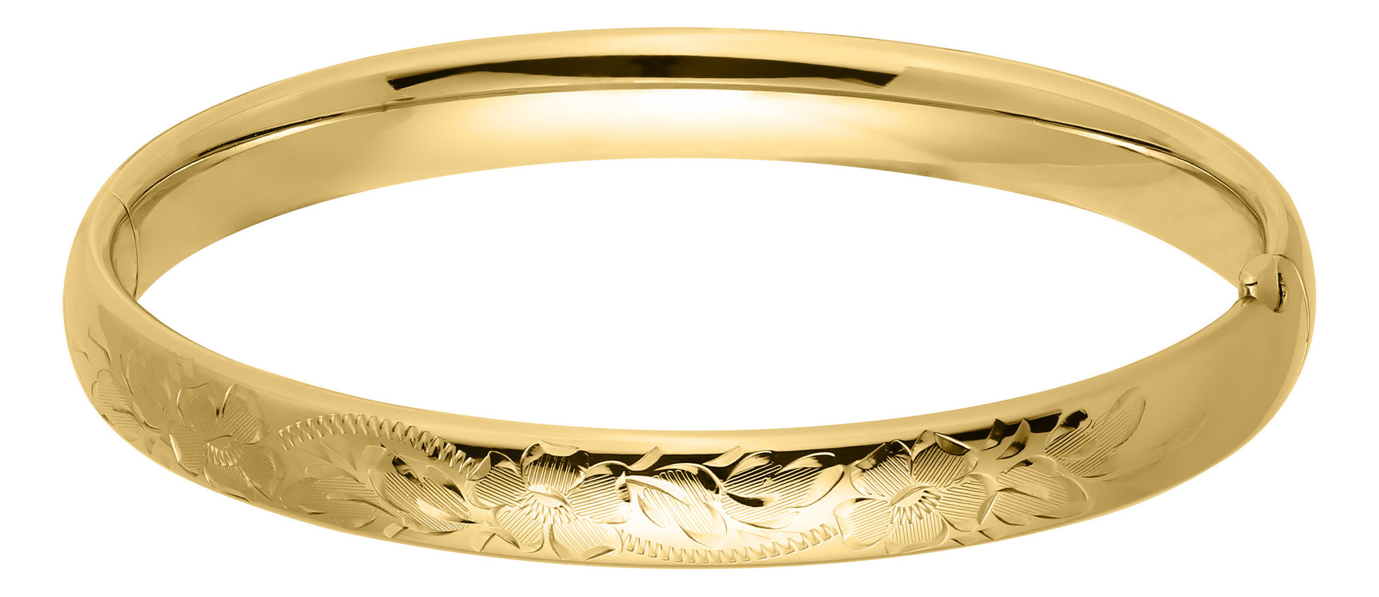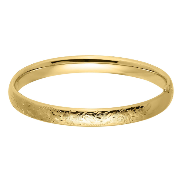 Mix and match this 14kt gold filled bangle with all your other pieces! This hand engraved bracelet is designed with a floral pattern and matte finish. Bracelet is secured with guard and hinge. Width: 8mm Bracelet Circumference: 7