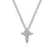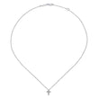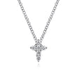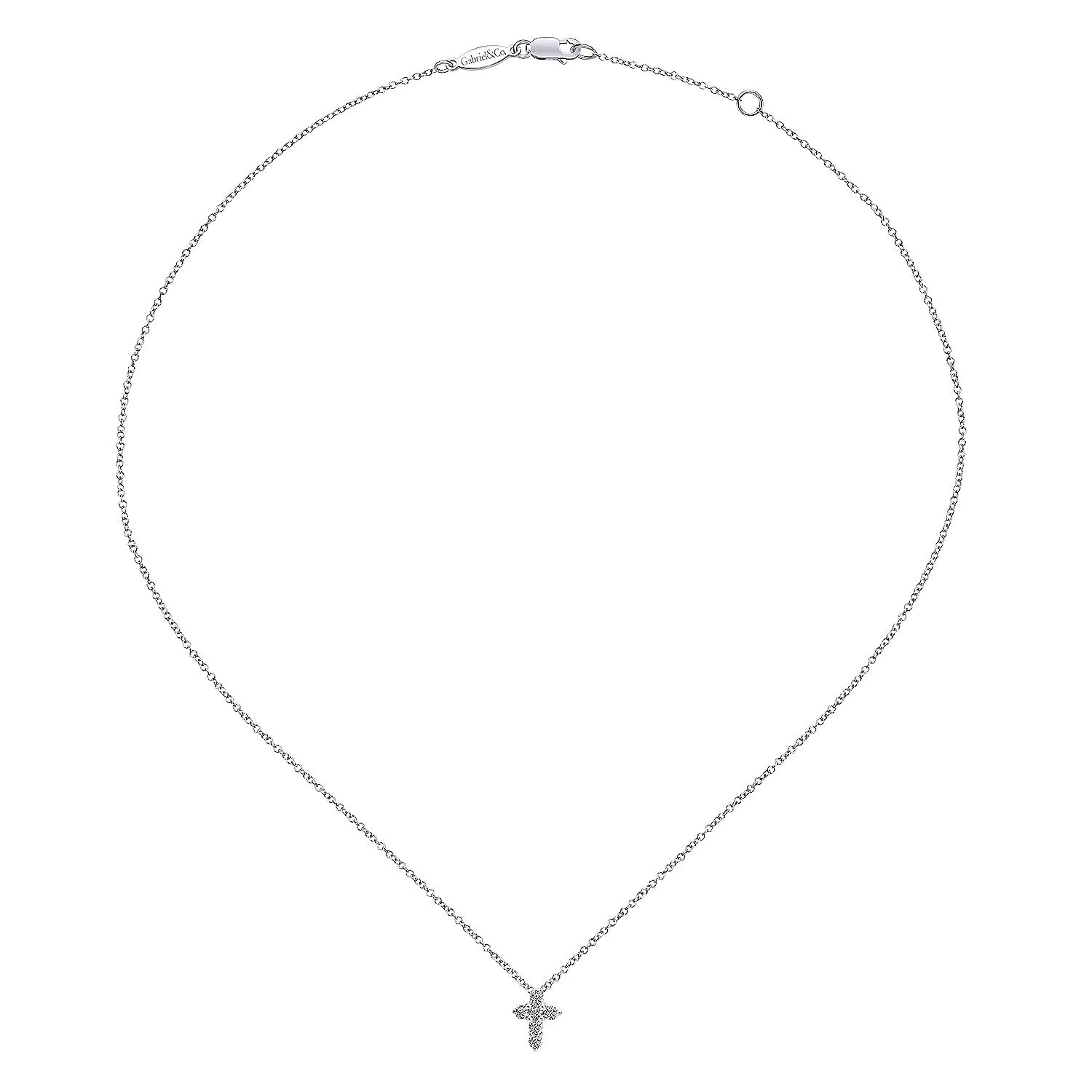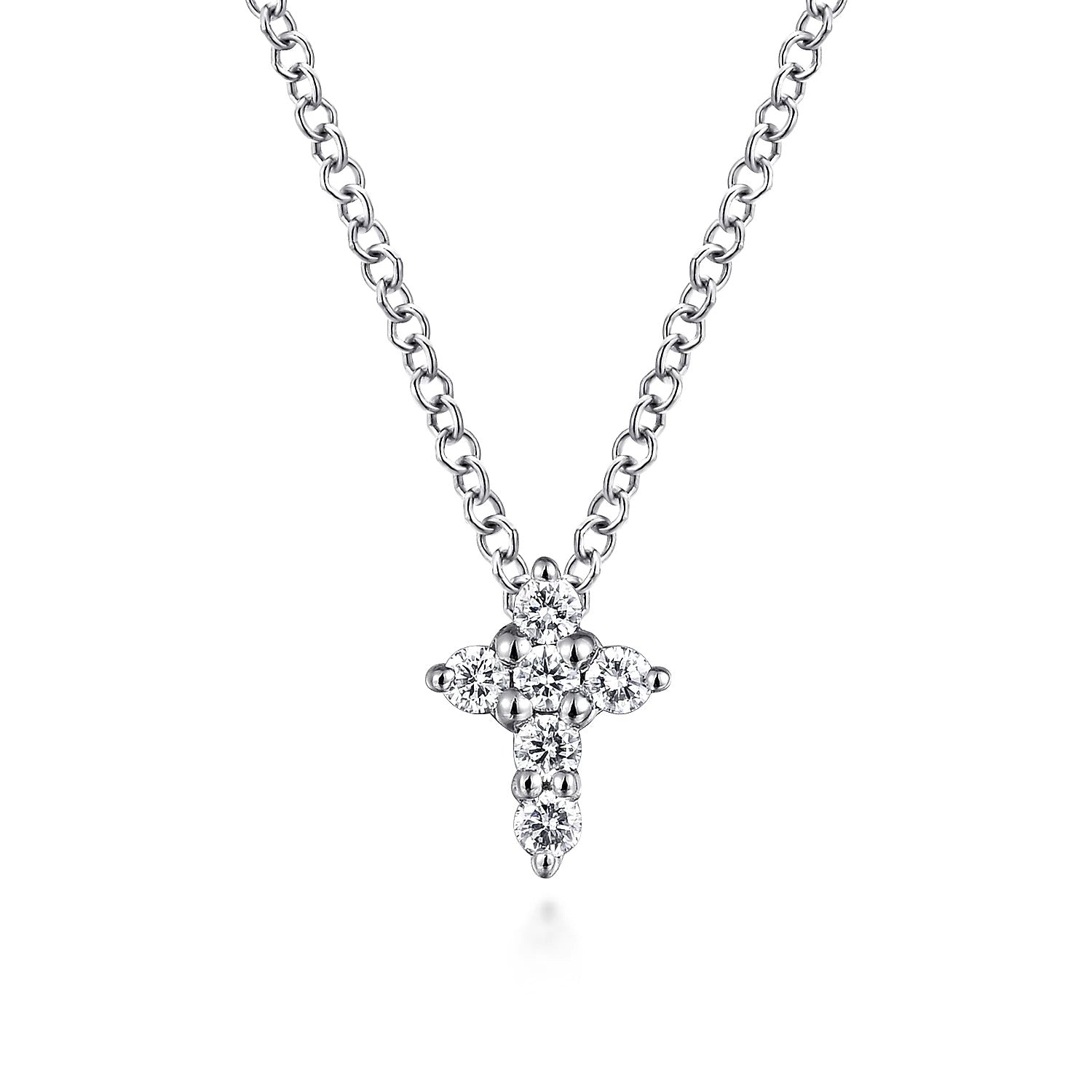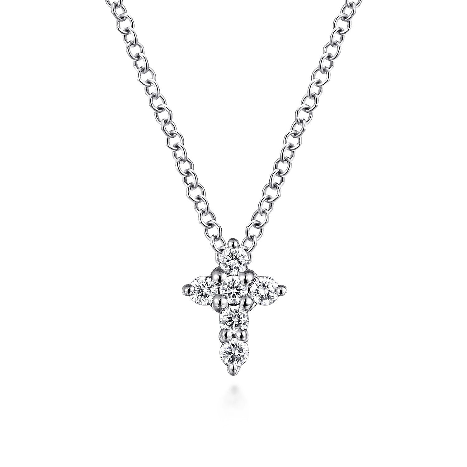 Modest, yet luxurious this 14K white gold cross pendant showcases prong-set .10 ct round-cut diamonds. This petite pendant style necklace is subtle, but offers details to be admired.