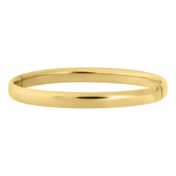 Mix and match this 14kt gold filled bangle with all your other pieces! This is the classic plain polish bracelet you have been searching for. Bracelet is secured with guard and hinge. Width 6mm Bracelet Circumference: 7