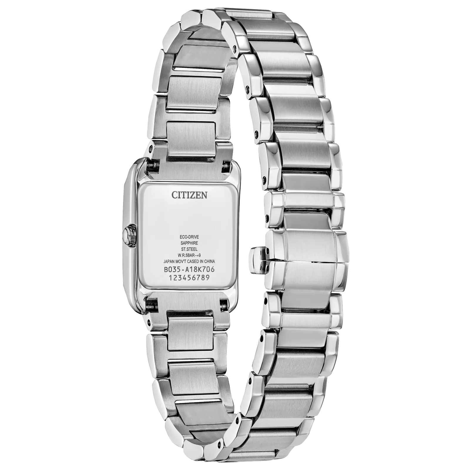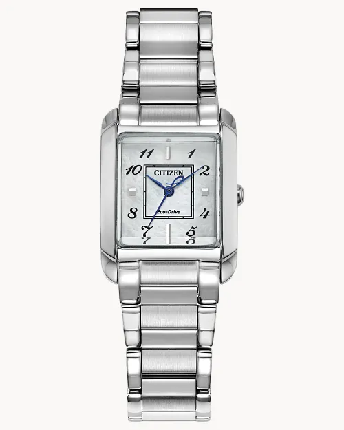 Classic lines and subtle sophistication make this latest piece to our women’s collection, the Citizen L Bianca, a charming addition of sustainable luxury. With a design inspired and celebrating feminine motifs in art deco, the distinctive stainless-steel timepiece is a captivating accent on the wrist that's perfect for everyday wear. A curved rectangular shape defines the watch's 22mm silhouette, with a subtle crown and stainless-steel bracelet rounding out the look. On its mother-of-pearl dial, alternating applied and printed markers work with a pair of blue-touched hands for a highly aesthetic style, with its printed inner square once again pointing to chic inspirations. Sustainably powered by any light with our proprietary Eco-Drive technology that never needs a battery, this elegant ladies’ watch is the perfect addition to any outfit. Water resistant to 50 meters. Caliber B035.
