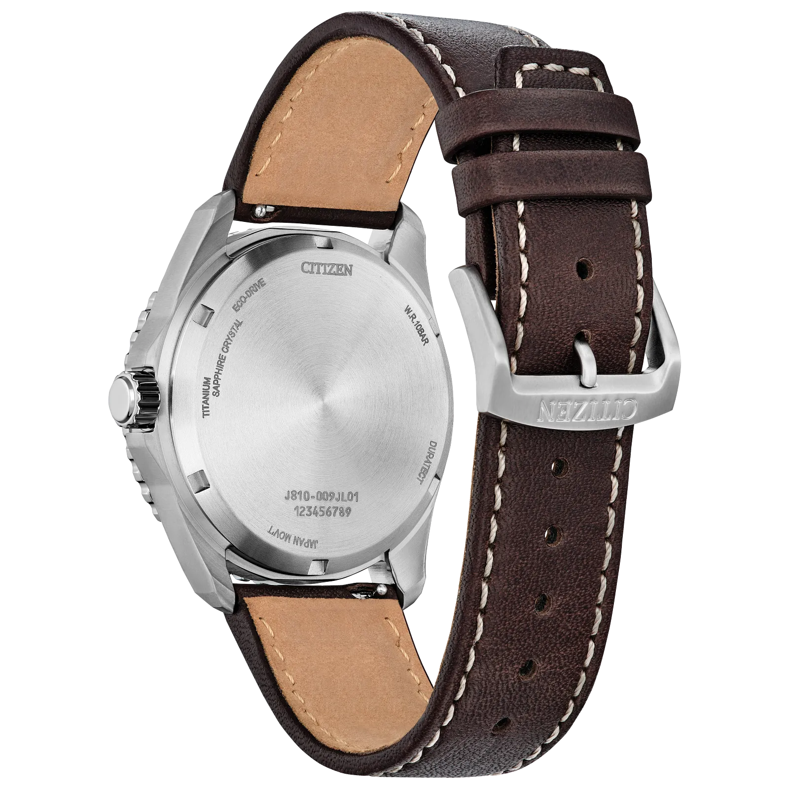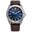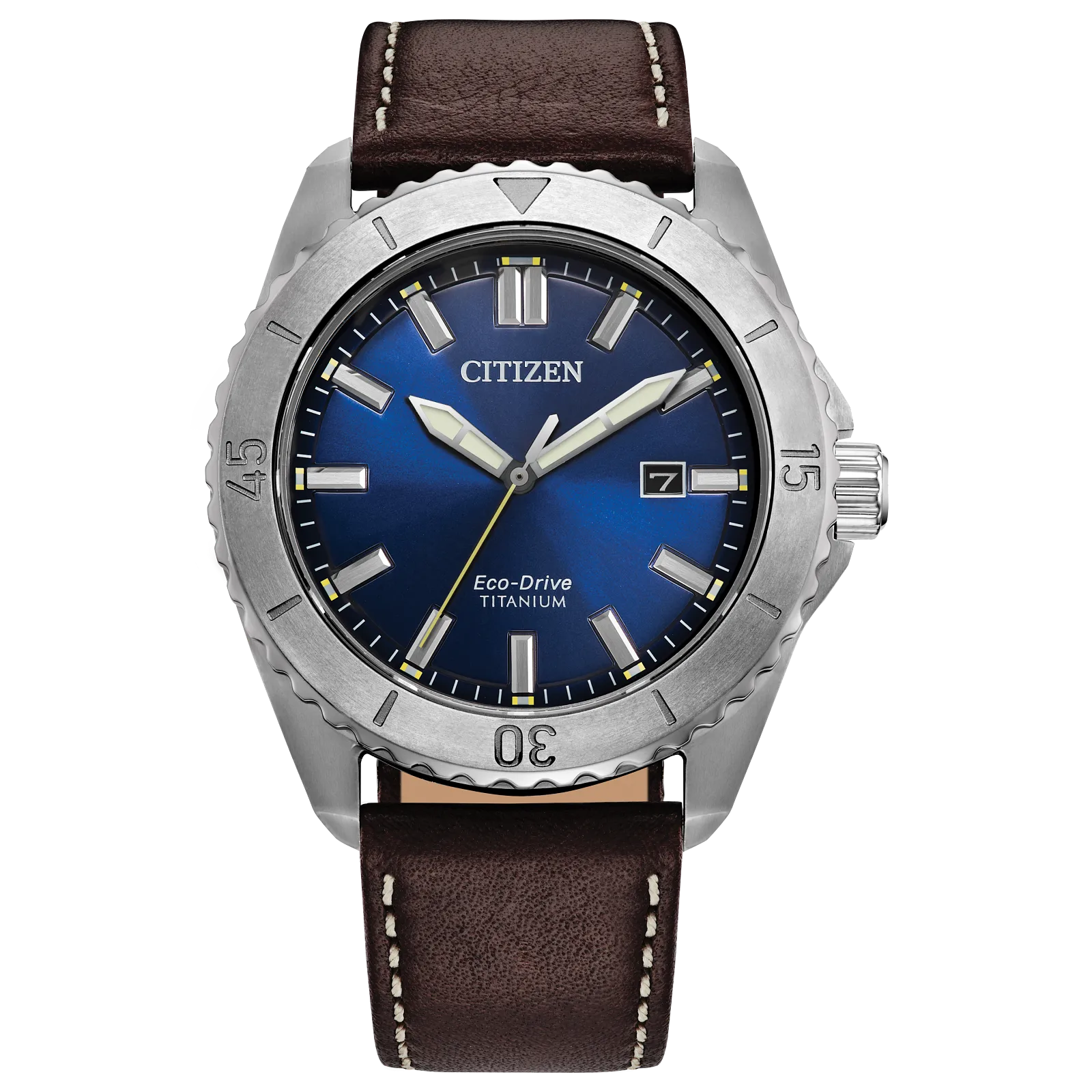 Take action and show your inner drive with the sporty styling of the Brycen, the latest addition to the Weekender collection. Featuring a silver-tone Super Titanium™ case with a brushed finish, the 41mm timepiece is durable in form and function with its matching bi-directional rotating bezel and triple-link bracelet. On the sunray blue dial, highly legible timekeeping elements are at work, with a yellow seconds counter providing a pop of color and a 3 o'clock date window providing daily utility. Featuring our proprietary Eco-Drive technology – powered by light, any light. Never needs a battery. Caliber number J810.
