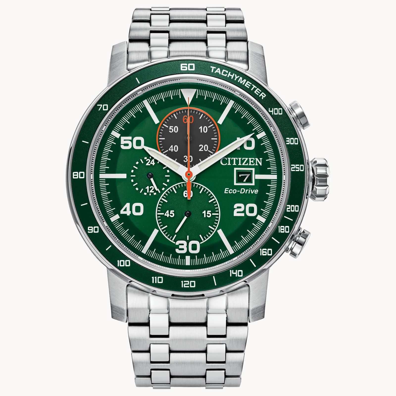 Effortlessly combining technological functionality with rugged sports watch design, the Brycen is a spirited expression of contemporary Citizen design. The robust silver-tone stainless steel case measures 44mm in diameter and has two distinct pushers on either side of the crown. Secured to the wrist by a silver-tone stainless steel bracelet, the timepiece is comfortable on the wrist and ready-for-anything with its water resistance to 100 meters. The green display of the chronograph is accented with vibrant red details and framed by a matching verdant bezel, creating an ultra-sporty appearance from case to dial. Features of the timepiece include a 1/5 second chronograph measuring up to 60 minutes, 12- and 24 hour time, and date indication. Powered by Citizen’s proprietary Eco-Drive technology to provide light-powered vitality continuously and sustainably without ever needing a battery.