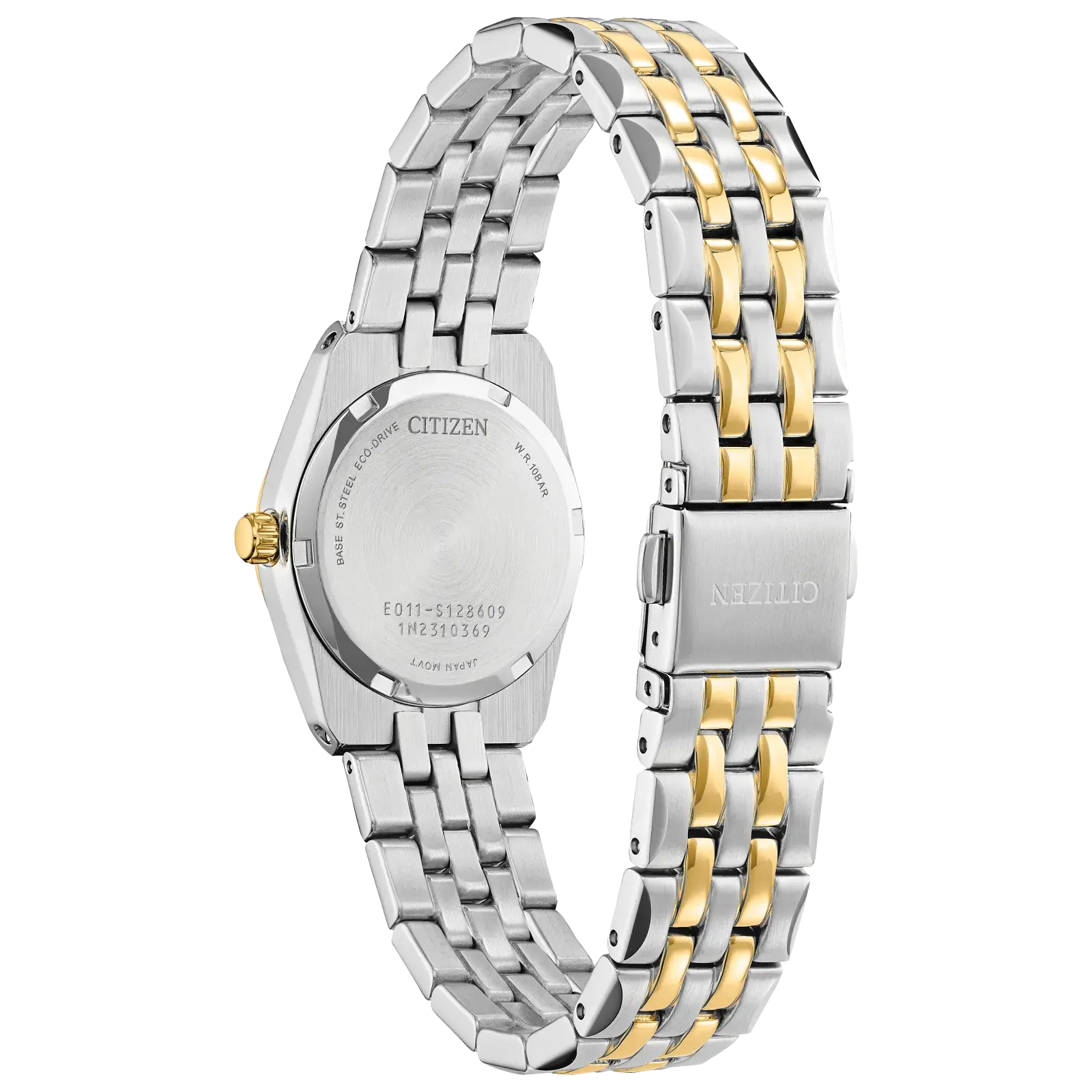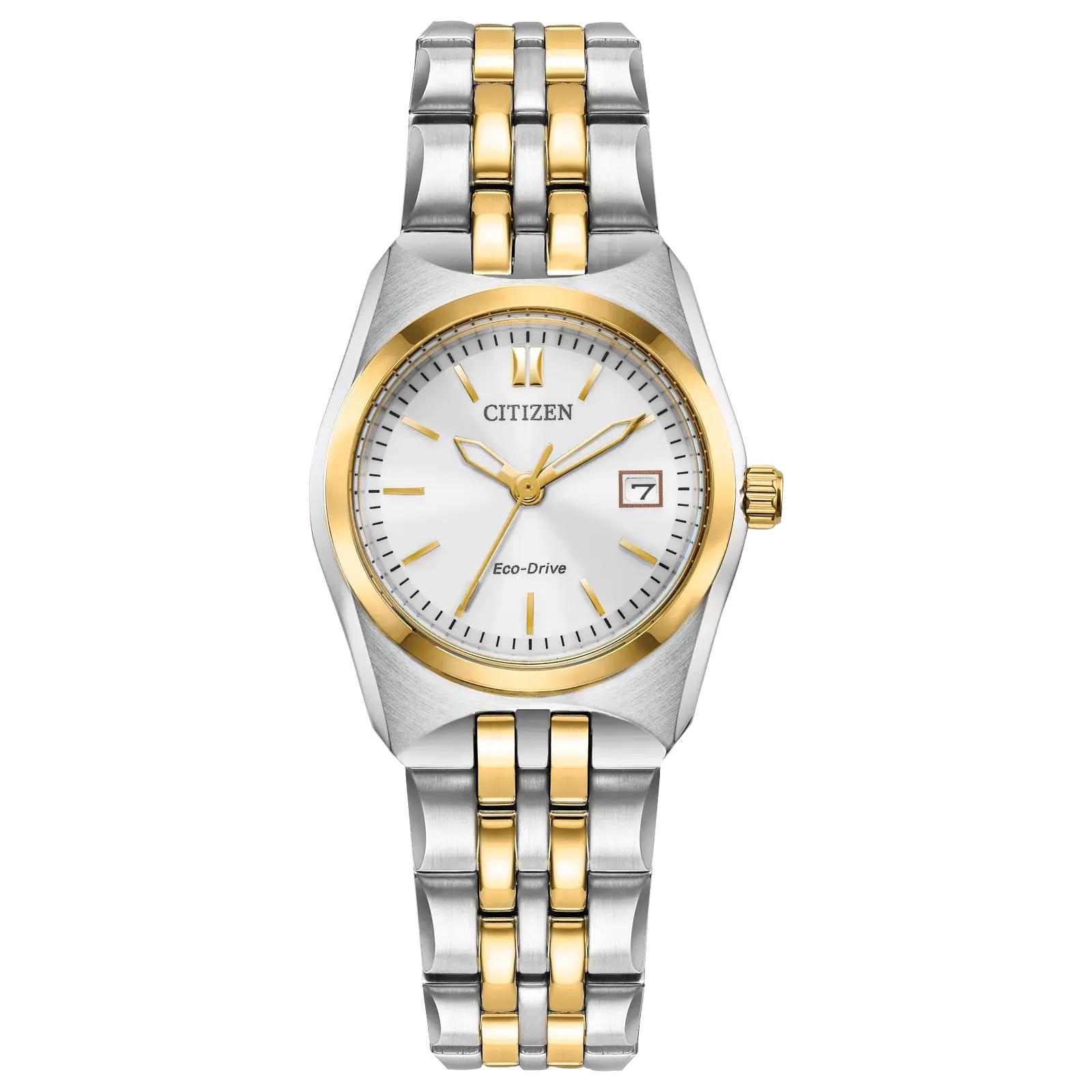 A classic timepiece is always in style in the Corso women’s watch from Citizen. Featuring a two-tone gold and silver-tone stainless steel bracelet and case with a 3-hand white dial and date indicator, luminous hands and gold-tone markers. This elegant timepiece also features a fold-over clasp closure with hidden push buttons and is water resistant to 100 meters. If you’re looking for a dress watch to add effortless style to your wardrobe, the Corso is the perfect choice. It also uses Citizen’s proprietary Eco-Drive technology, so it is sustainably powered by any light and will never need a battery. Caliber number E011.
