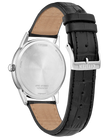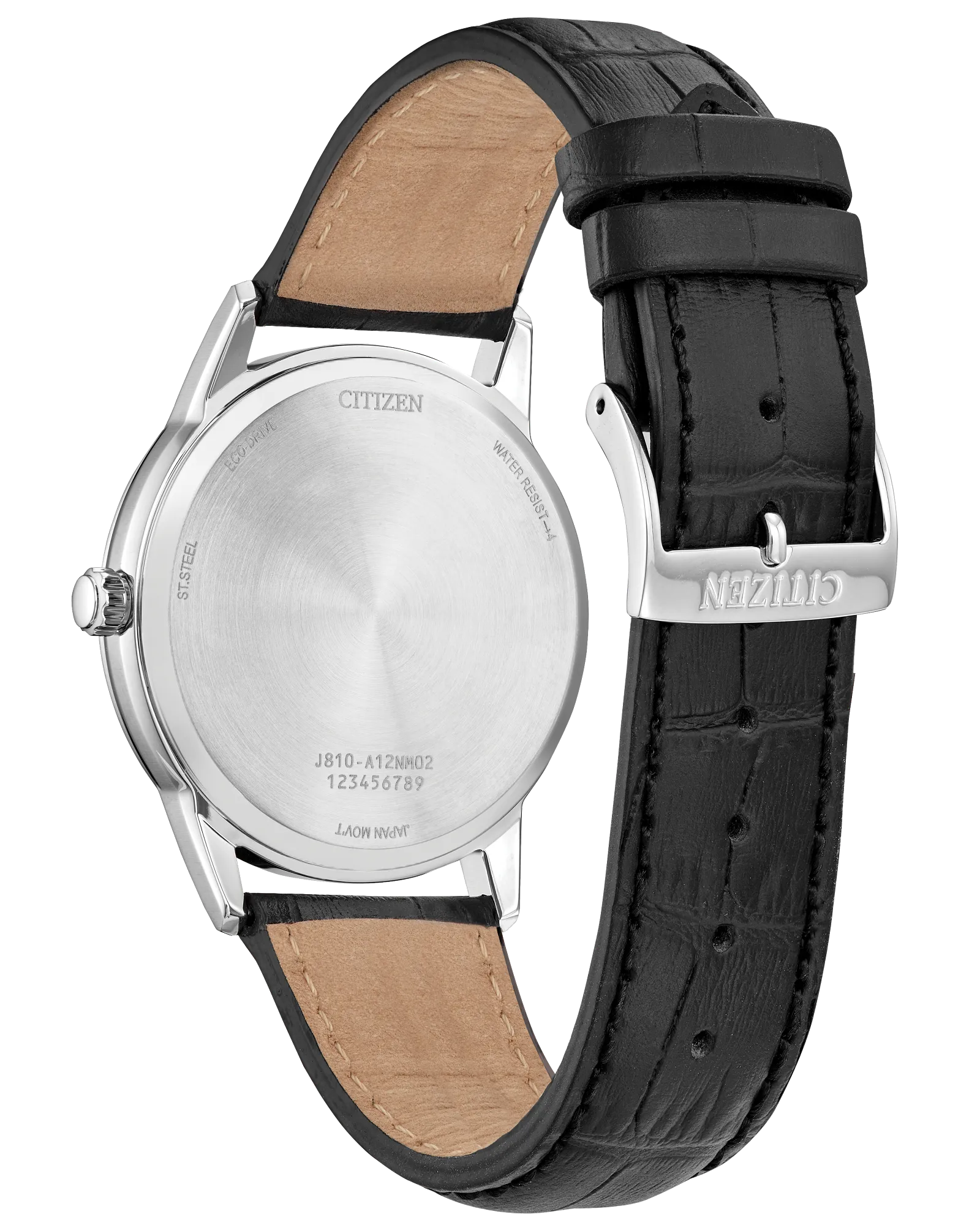 Classic lines and a simple silhouette define the newest addition to the Classic collection. This vintage-inspired timepiece features a silver-tone stainless steel case, a striking blue 3-hand dial with a date function, and a rich black leather strap with buckle closure. Sustainably powered by any light with Eco-Drive technology and never needs a battery.