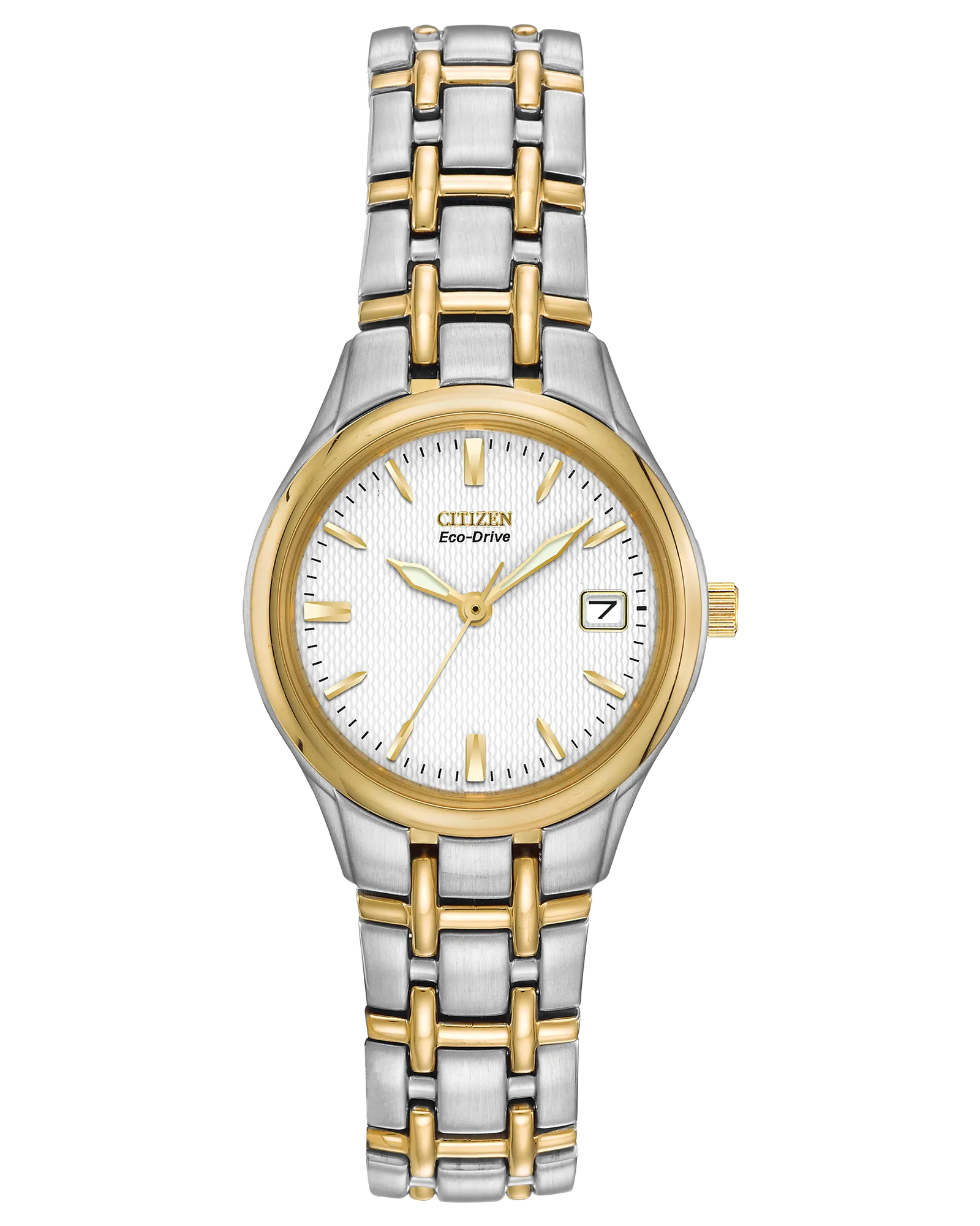 This Citizen Eco-Drive Silhouette is the epitome of versatility, making it perfect for any occasion. This is a 3-hand model with luminous hour and minute hands, a date indicator, and a clean white dial set in a stainless steel two-tone 25mm case and bracelet. Featuring our Eco-Drive technology – powered by light, any light. Never needs a battery. Caliber number E011.