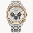 Make a distinctive style statement with the new Citizen men’s dress watch from the Classic collection. The two-tone stainless steel case holds the silver-tone dial with a 1/5 second chronograph that measures up to 60 minutes, 12/24-hour, time and date.