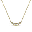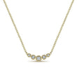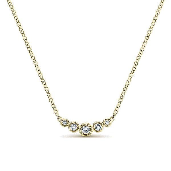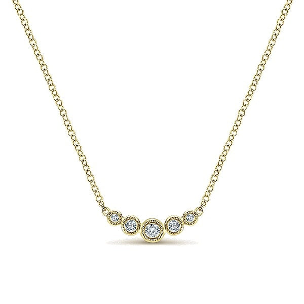 This dainty diamond necklace features a quintet of bezel set round stones arranged by size in a gentle arc. The 14kt. yellow gold design includes a classic cable chain and refined milgrain borders. Sweet and simple, it's an everyday essential necklace. (.10ctw)