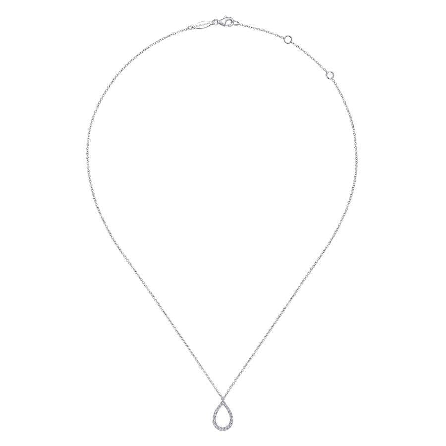 The gorgeous pear-shaped diamond design (0.15ctw) radiates elegance. The stunning pave stones are set in gleaming 14K white gold.