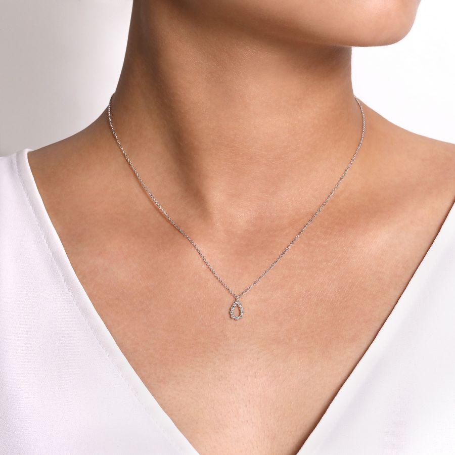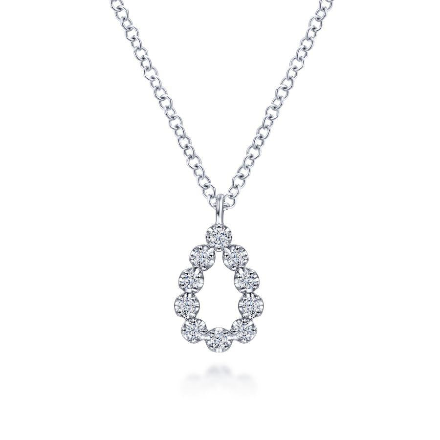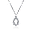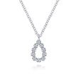 Made in 14 karat white gold, this simple teardrop style necklace features .10 ctw pave set diamonds.