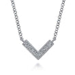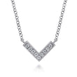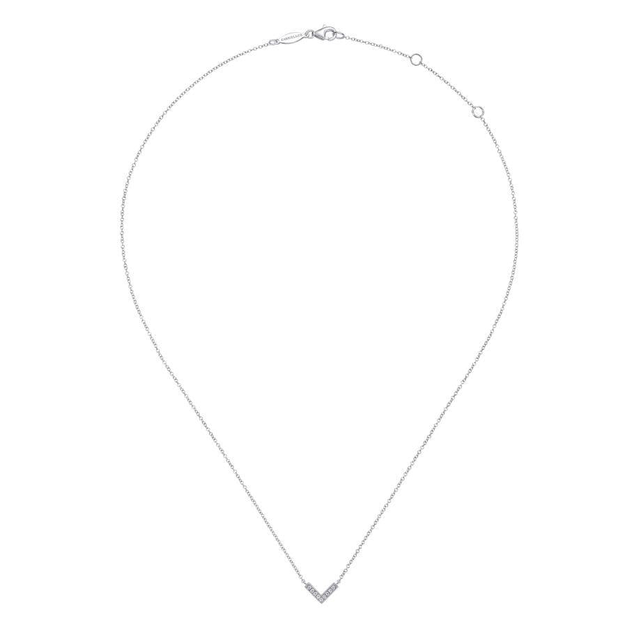 Made in 14 karat white gold, this petite V shaped chevron style necklace features .05 ctw pave diamonds.