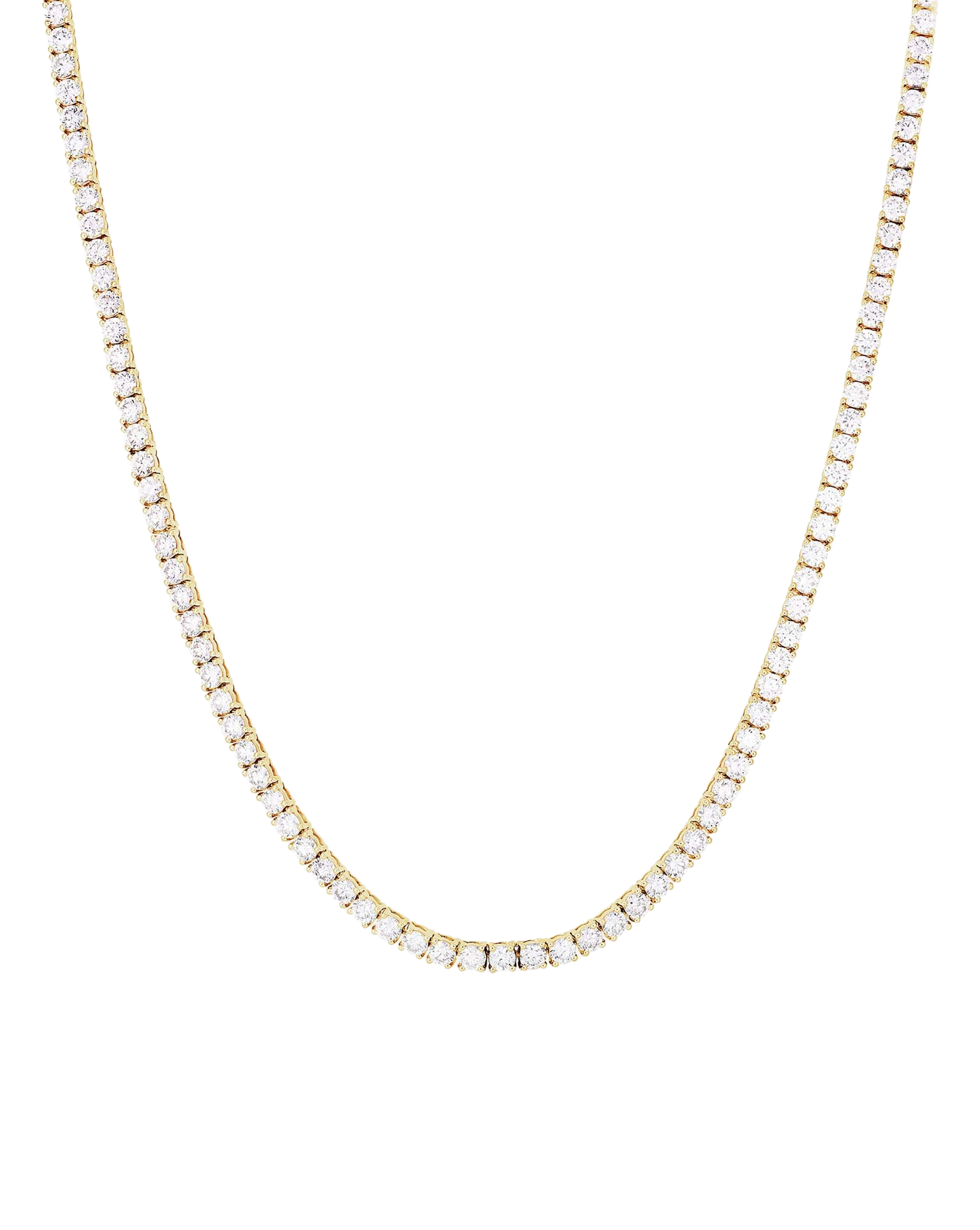 It's the timeless tennis necklace with no shortage of sparkle! Polished 14K yellow gold settings boast 186 round brilliant-cut diamonds (7.45ctw) that grace the neckline with glimmer and gleam. The diamonds are I in color and VVS-VS in clarity.