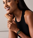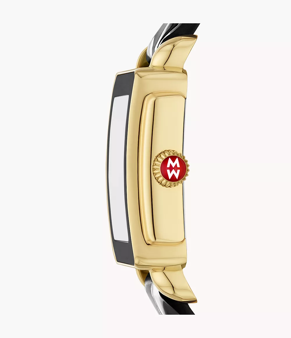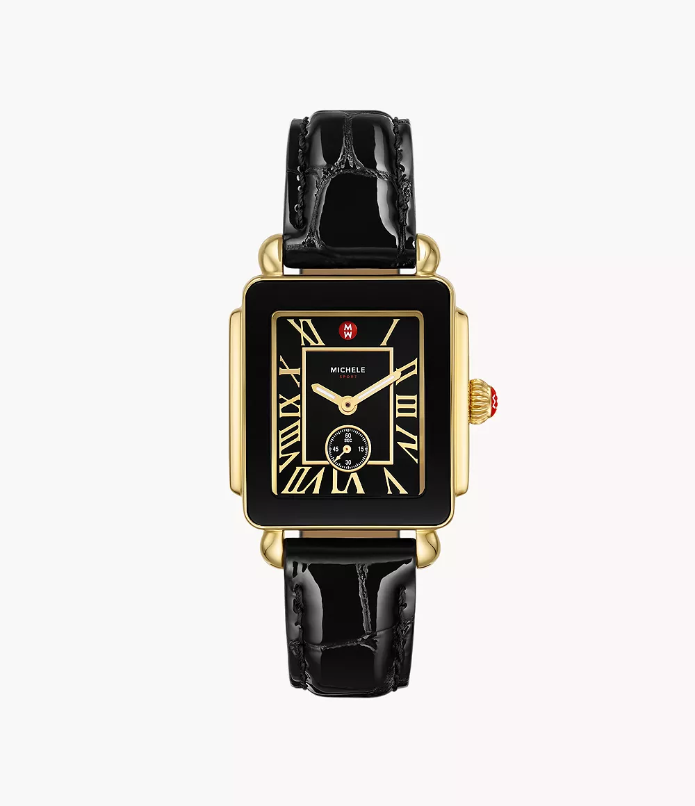 The Deco Mid Sport combines a noir color with refined design. Its 31mm rectangular gold-tone stainless steel case frames a glossy black dial, accented with polished roman numeral indexes and a sub-second movement. The shiny, croco-embossed leather strap, is interchangeable with any 16mm strap from MICHELE's collection, adding versatility to the design.