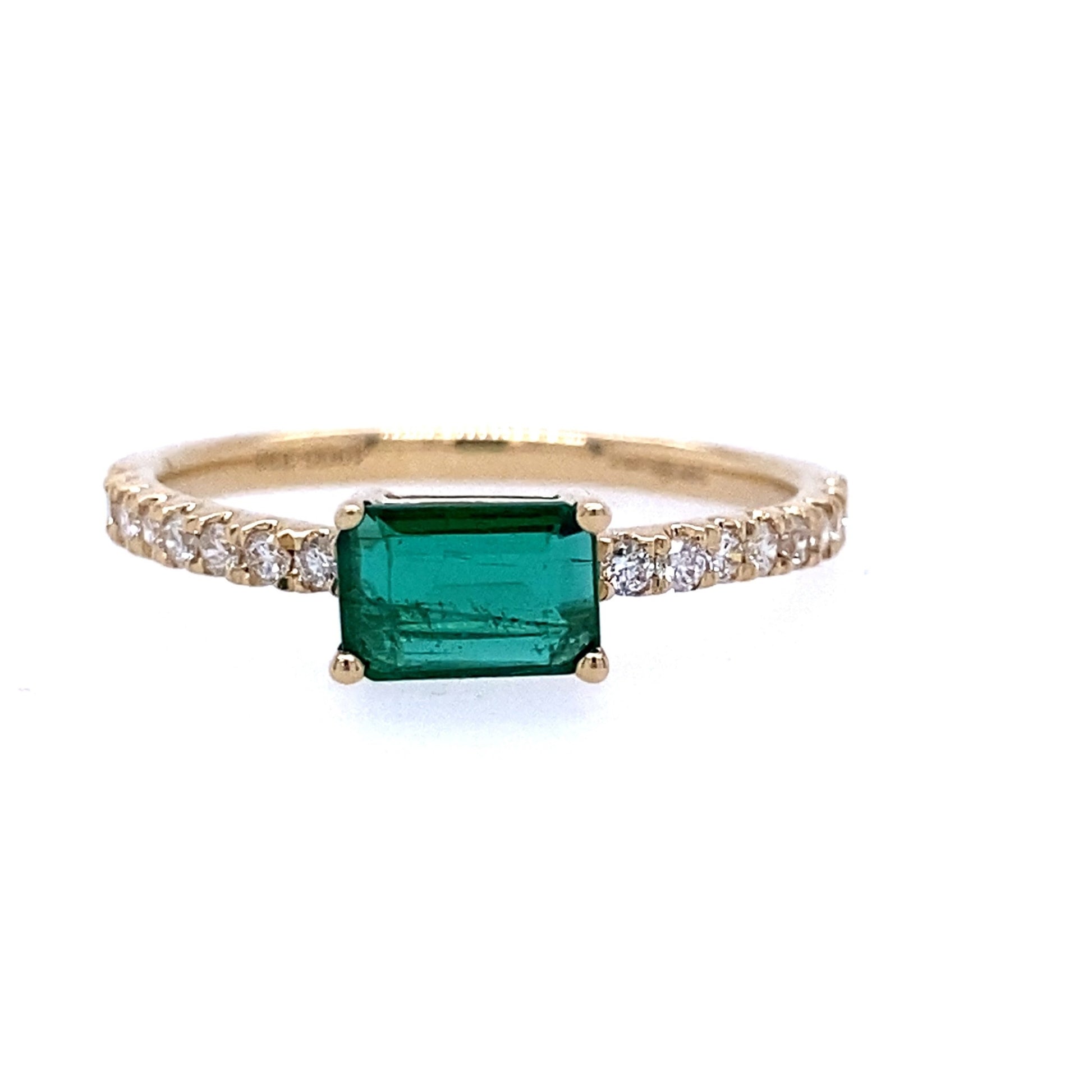 Simple yet vibrant, this emerald ring is the trendy style your jewelry collection needs. The enchanting May birthstone is nestled between pave diamonds (0.19ctw). Crafted from 14K yellow gold, this ring is unique as the emerald is set east to west.