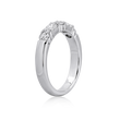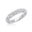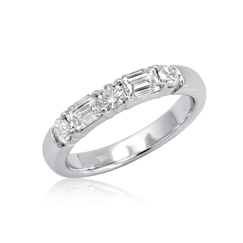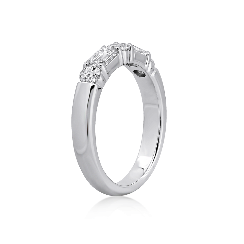 Alternating emerald cut and round diamonds are shared-prong set atop a 3.2 mm wide band.