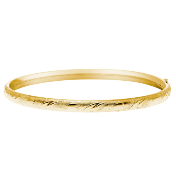 Mix and match this 14kt gold filled bangle with all your other pieces! The bracelet is beautifully hand engraved with a heart design that you are sure to love. Bracelet is secured with guard and hinge. Width: 5mm Bracelet Circumference: 7
