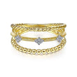A dynamically textured fashion ring showcasing three distinct styles. Beaded and twisted strands of 14kt. yellow gold flank a central band garnished with three clusters of sparkling pave diamonds totaling .06ctw. Take the guesswork out of creating the perfect ring stack with this lovely layered style.