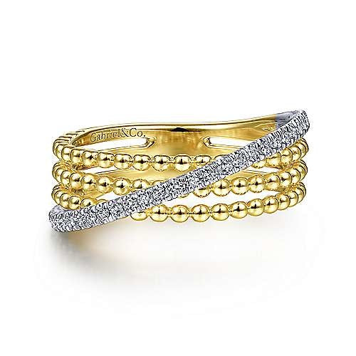 Add a sophisticated touch to your everyday jewelry collection with this mixed metal Bujukan ring. Three rows of beaded 14K yellow gold polished to a gleaming finish are garnished with a shimmering 14K white gold and 0.19ctw pave diamond sash that wraps diagonally across the ring.