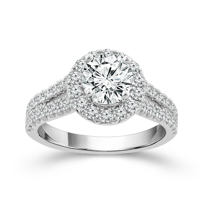 Crafted from 14k white gold, you're ready to pop the question with this stunning halo style engagement ring. Featuring a 1ct round diamond in the center, this ring is enhanced with 3/4ctw of pave diamonds in the halo and split shank. (1 3/4ctw)