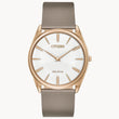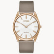 Sleek, contemporary and ultra-thin are key components to the revitalized Citizen Stiletto collection. The Stiletto is featured in a rose gold-tone stainless steel case, stylish taupe calf strap and white dial. Featuring Eco-Drive technology.