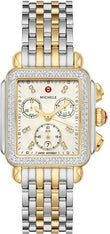 The rectangular case of the Deco two-tone 18K gold diamond watch reflects the geometric shapes identified with Art Deco architecture. This iconic Swiss chronograph timepiece features 120 brilliant hand set diamonds (.60ctw) along with the bezel and mother of pearl dial, three subeyes accented with gold foil and engraved MICHELE logos within the case walls. A two tone 18k gold plated seven link bracelet adds the finishing touch and is interchangeable with any 18mm MICHELE strap.