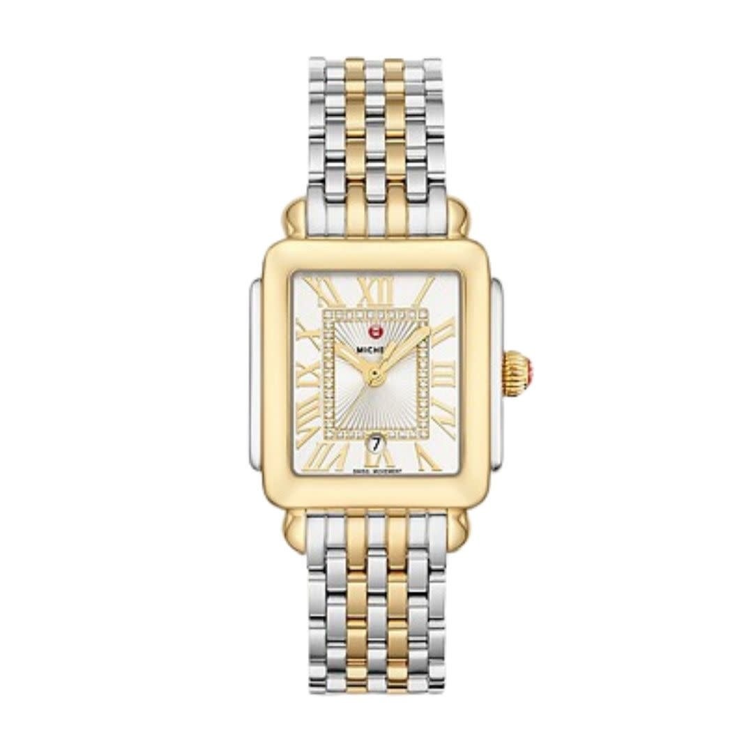 This two-tone Deco Madison shines with 40 hand-set diamonds atop the silver white sunray dial. The two-tone 18K gold bracelet is made specifically for the Deco Madison Mid collection and is interchangeable with any 16mm MICHELE strap.