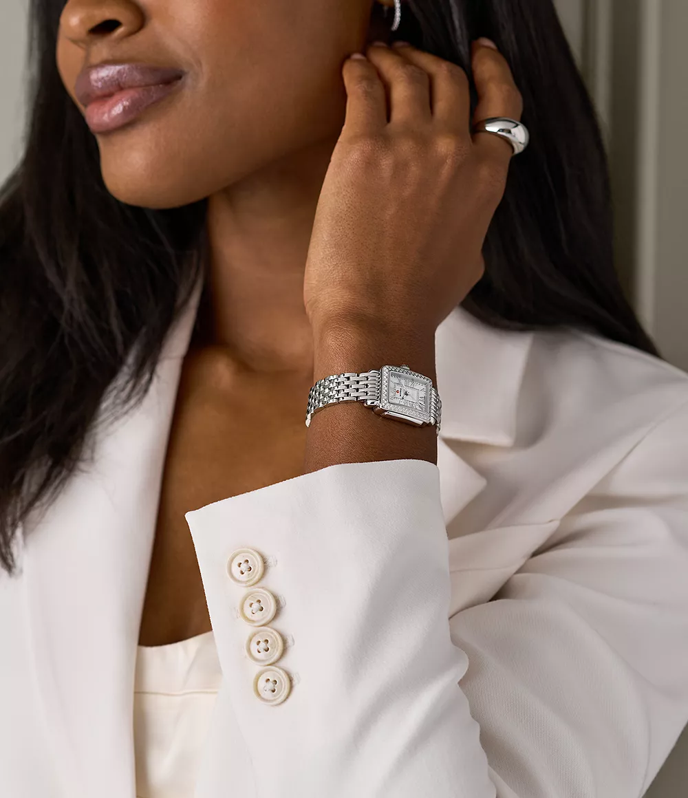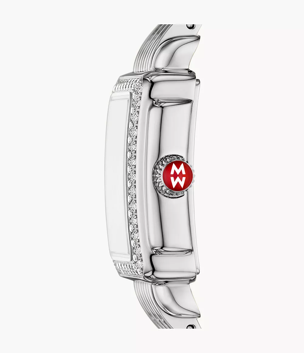 This petite stainless steel rectangular timepiece perfectly balances vintage-inspired style with a modern edge. The white mother-of-pearl dial shines with 122 diamond accents (0.43 carat weight) and Swiss movement. The stainless steel bracelet is made specifically for the Deco Madison Mini collection and is interchangeable with any 12mm MICHELE strap.