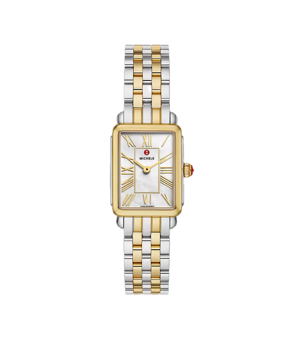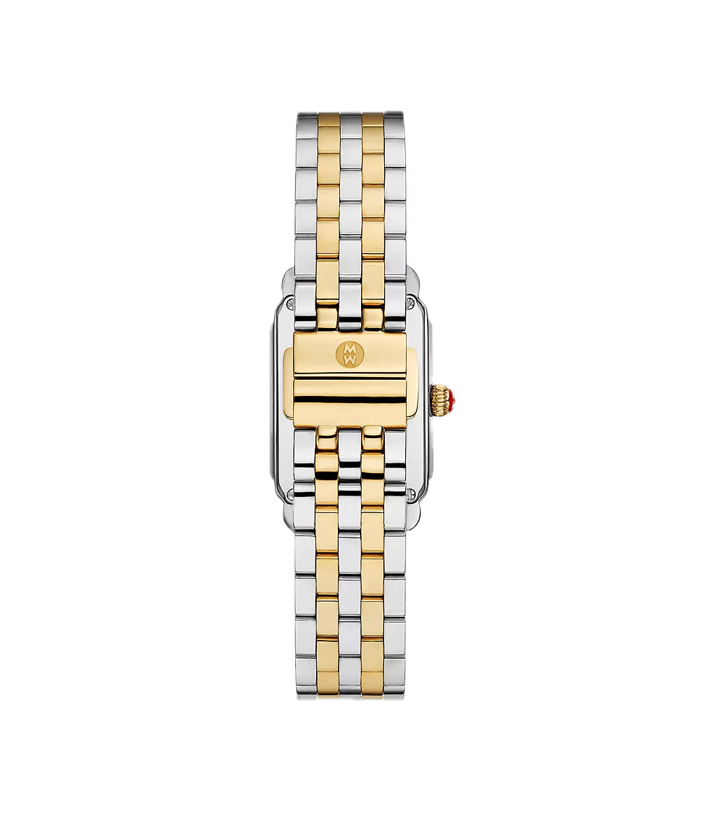 Elegant and architectural, this rectangular watch from the Deco Park collection perfectly balances form and function. The glossy white mother-of-pearl dial is housed within a two-tone stainless steel and 18K gold-plated case and Swiss movement. The two-tone 18K gold-plated bracelet is made specifically for the Deco Park collection and is interchangeable with any 14mm MICHELE strap.