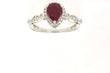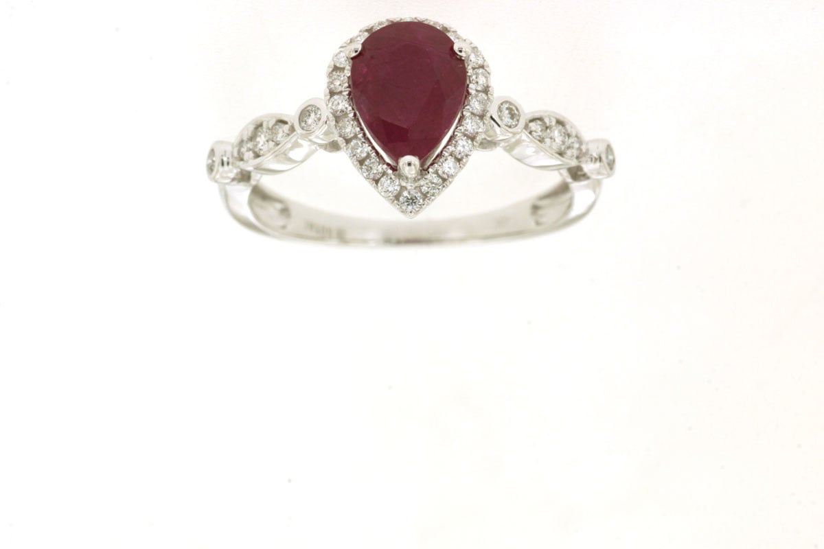 July’s birthstone, the Ruby, is a brilliant expression of health, love, and wisdom. A 1.12ct pear cut ruby is enhanced with a stunning diamond halo.