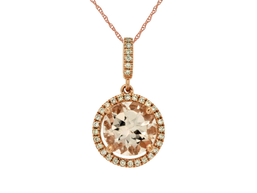 A round morganite (1.75ct) is suspended from a 14k rose gold chain and enhanced by a sparkling diamond halo (.13ctw).