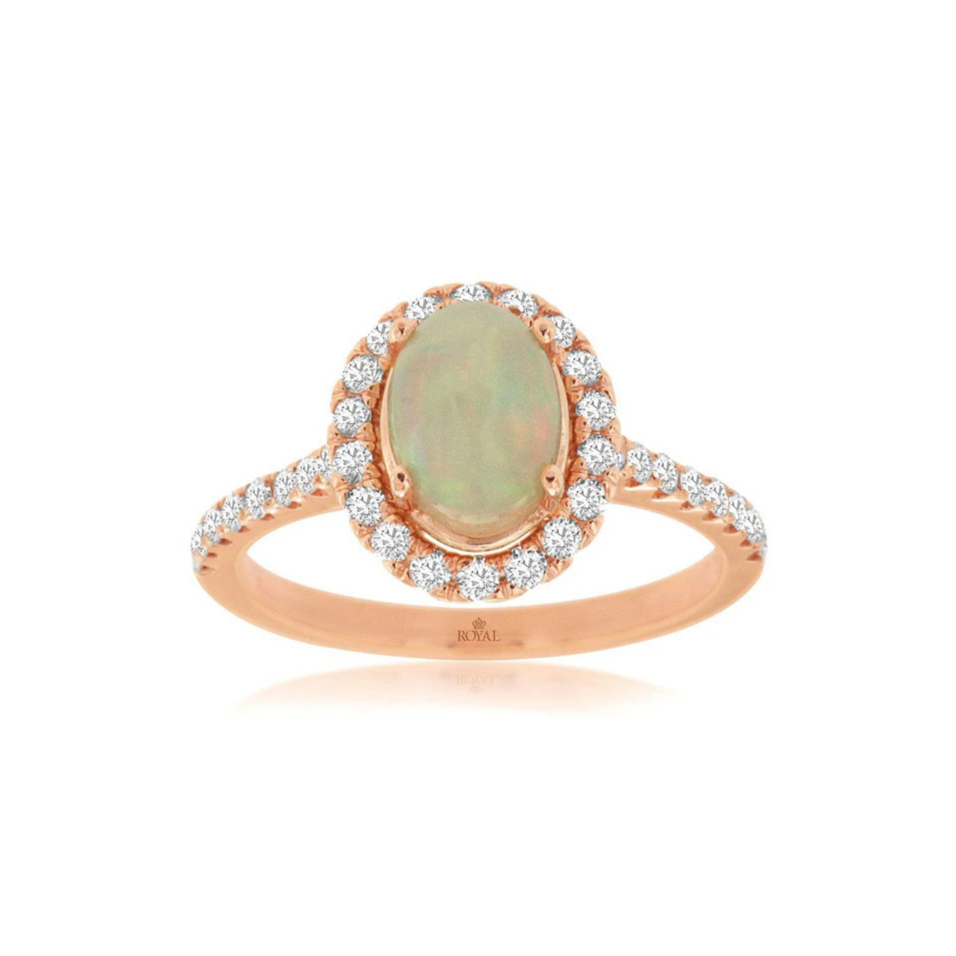 Introducing our exquisite 14K Rose Gold Opal and Diamond Ring, a stunning piece that seamlessly blends elegance and vibrant color. This ring features a captivating 1.0ct Opal at its center, showcasing an array of shimmering hues that dance with every movement. Surrounding the opal are .50ctw of diamonds, adding a touch of brilliance and sparkle to the design. Crafted from premium 14K rose gold, this ring offers a warm, luxurious finish that enhances the opal’s fiery play of color. Perfect for special occasions or as a timeless addition to any collection, this ring is a true statement of sophistication and beauty.