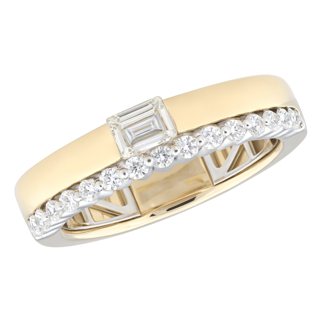 Sleek, versatile, and endlessly elegant, this stackable band blends modern design with timeless sparkle. Crafted in platinum and 14K yellow gold, it showcases a .42ct emerald-cut diamond at the center, accented by a .33ctw of pavé-set round diamond band for a total of .75ctw.