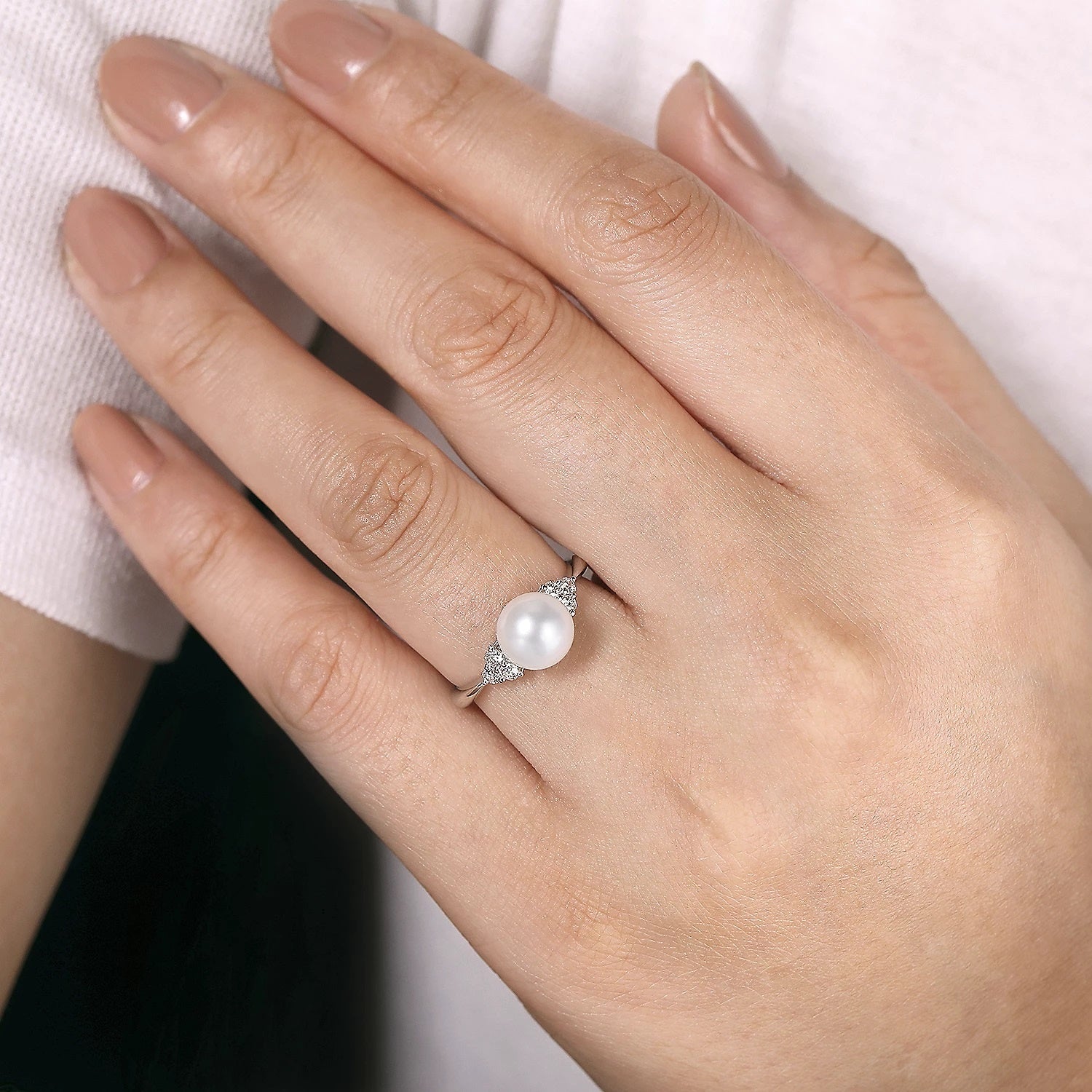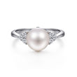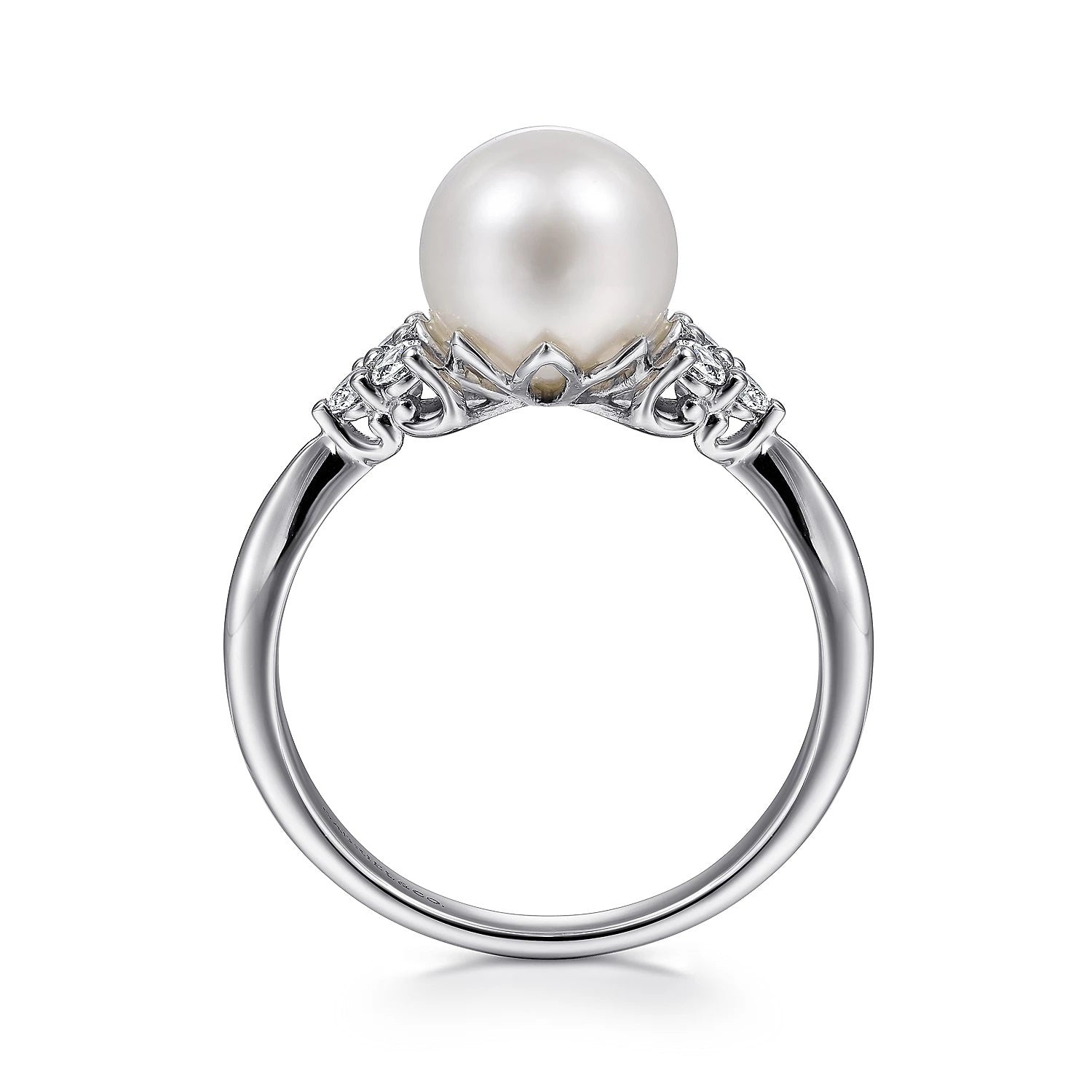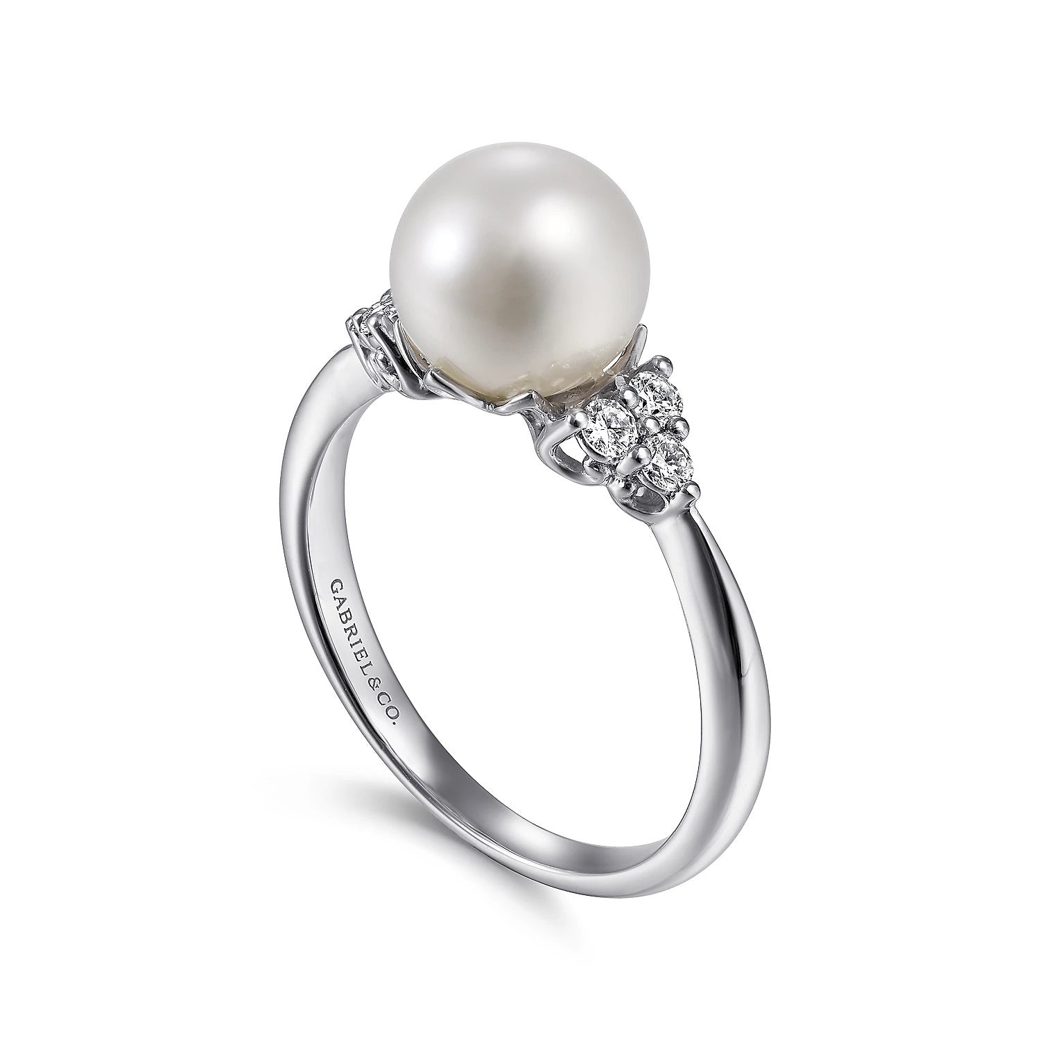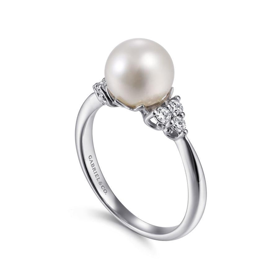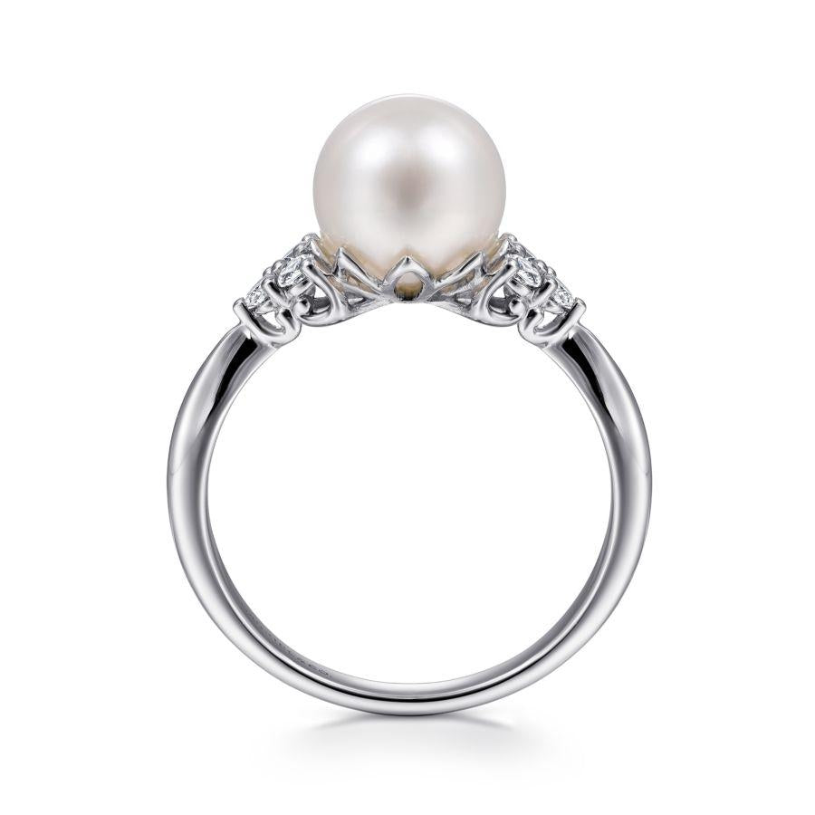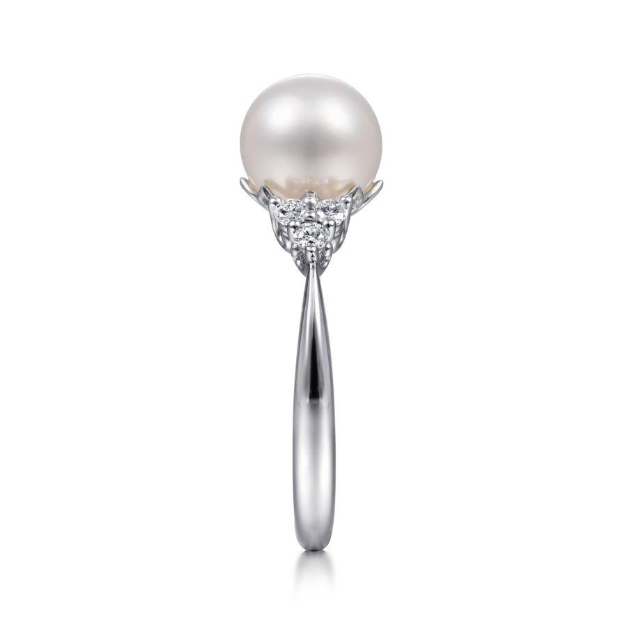 In this polished ring, the spotlight is on the timeless beauty of an iridescent cultured pearl. Trios of prong set round diamonds add 0.17cts of sparkle and shine to the shoulders of the tapered 14K white gold band.