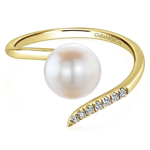 With its stylish open silhouette, this 14kt. yellow gold fashion ring wraps delicately around the finger. Capped on one end by a lustrous pearl and on the other by a tapered strand of glistening .05ctw pave diamonds, this ring brings sophistication to both daytime and evening looks.
