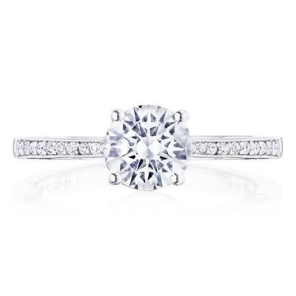 Dainty and sweet, a round cut diamond solitaire rests gently on a diamond band, with the Coastal Crescent inner face with pinpoint diamond details for a truly regal look. Center diamond not included, setting only.