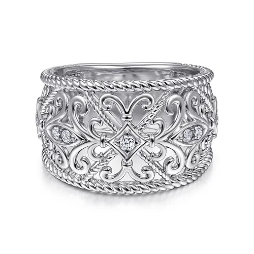 SS FLORAL OPENWORK WIDE BAND W/WHITE SAPPHIRES(SZ6.5)