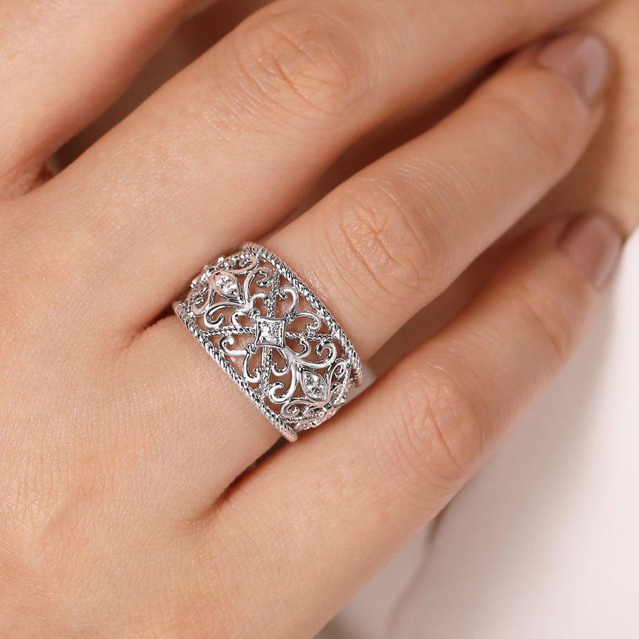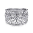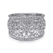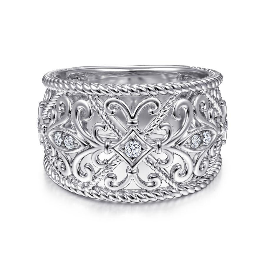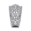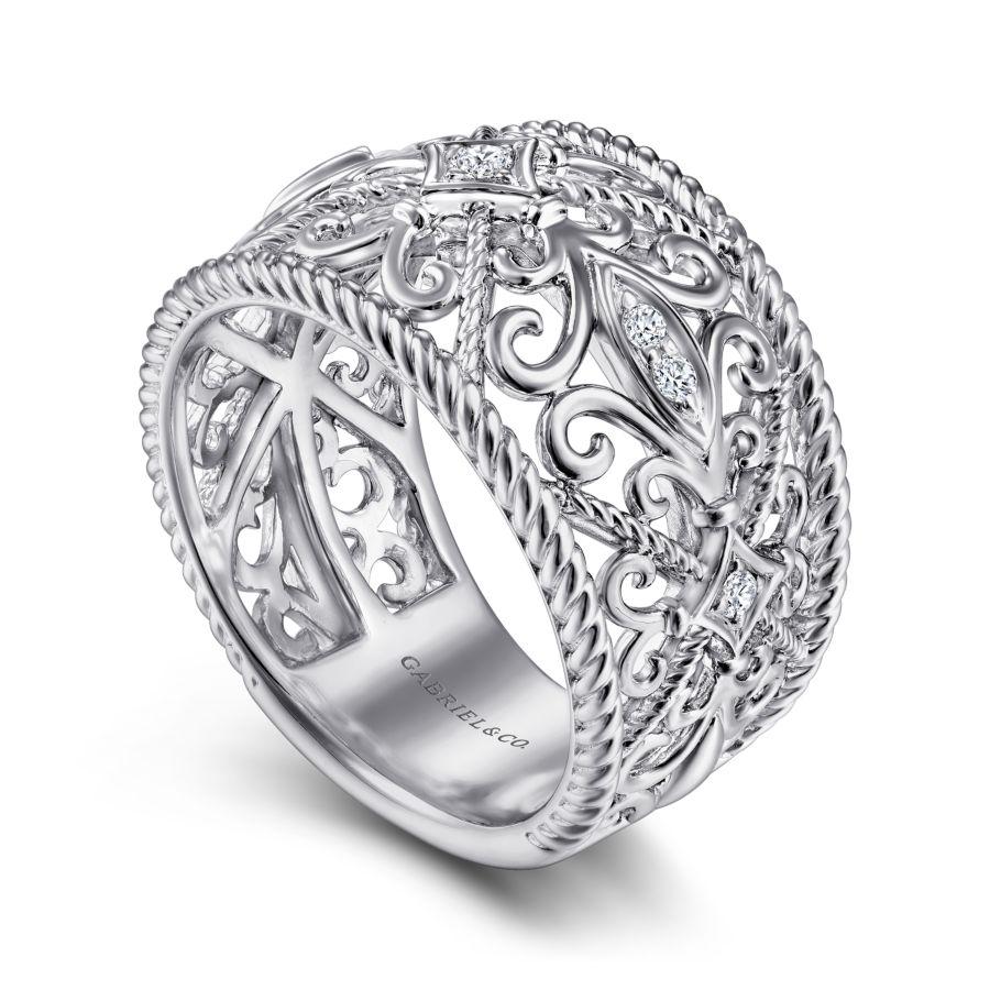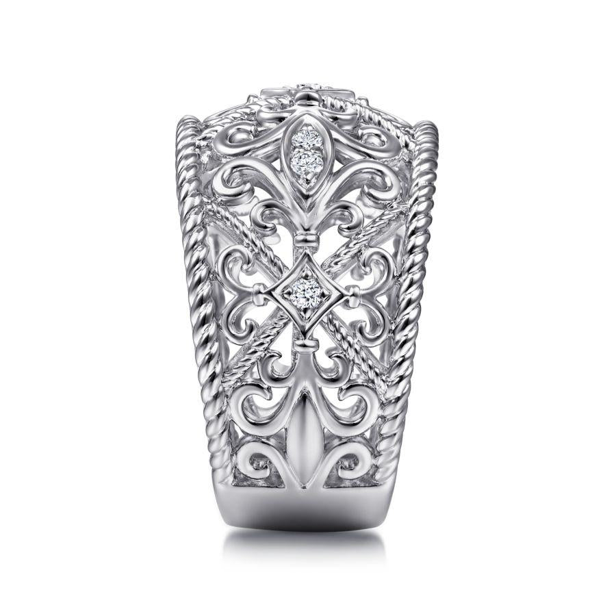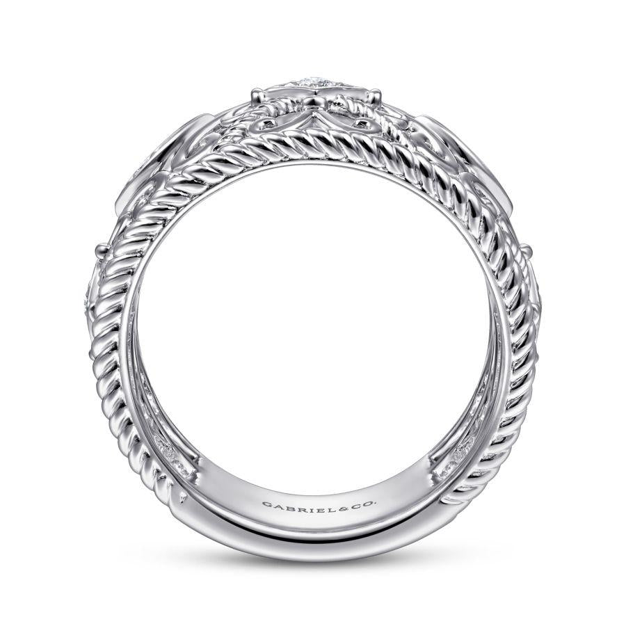 This wide band ring contains a multitude of textures and finishes. Layered strands of polished 925 sterling silver and sparkling white sapphires add personality and variety to your ring collection.