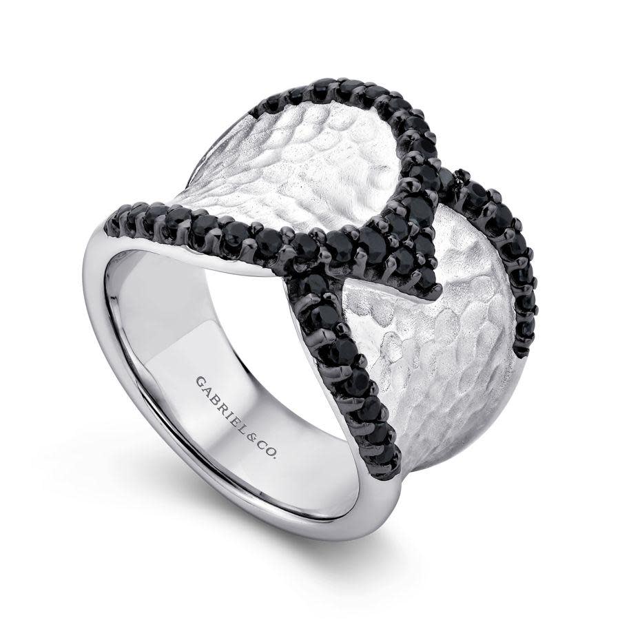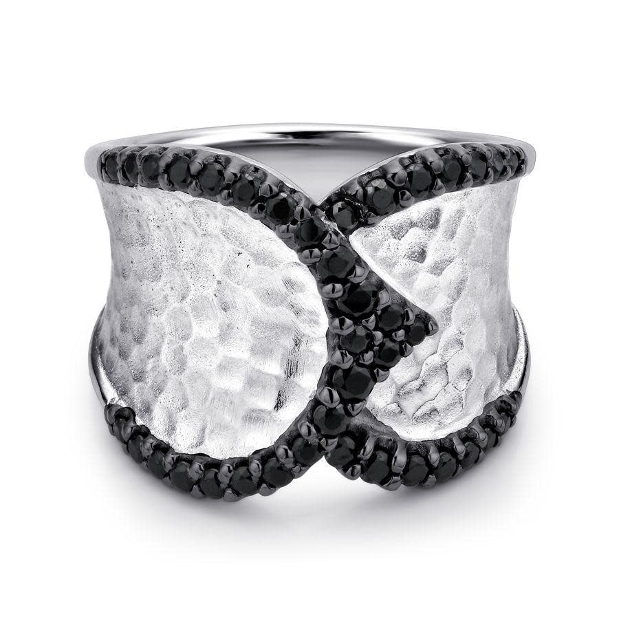 An eye-catching fashion ring crafted from sterling silver that makes for an impressive, singular piece. The wide band design is embellished with a striking hammered texture and outlined in edgy black spinel borders.