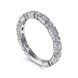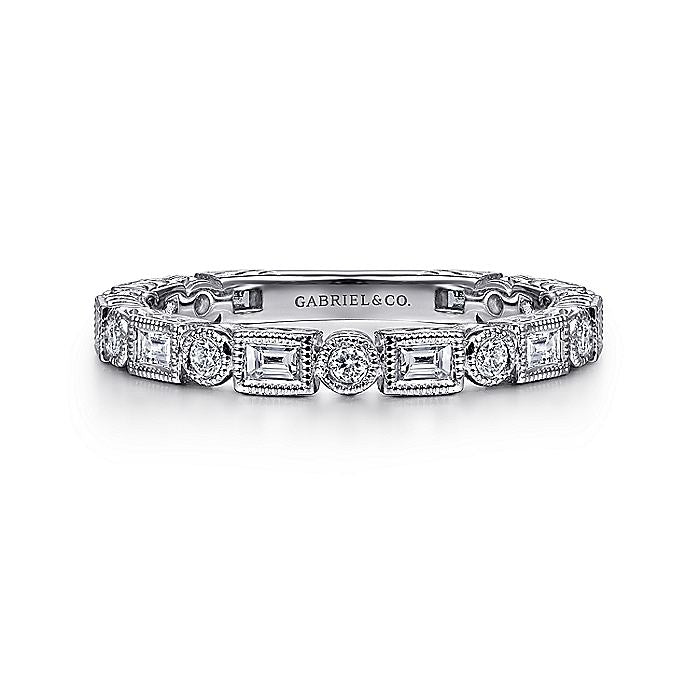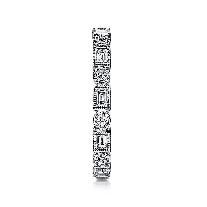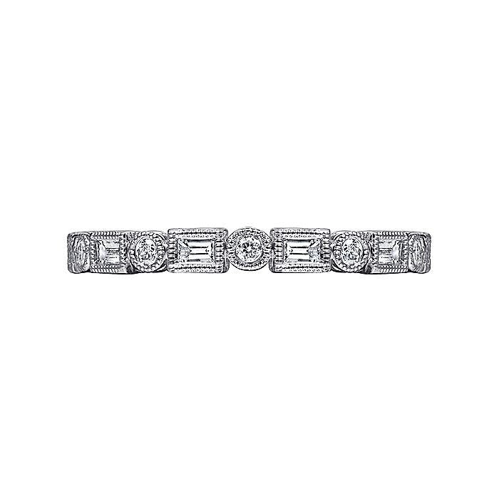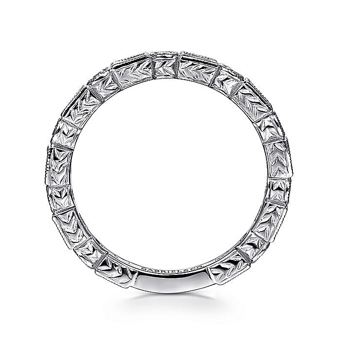 Alternating round and rectangular shapes are studded with 0.50cts of resplendent diamonds in this 14K white gold stackable ring that draws the eye with a masterfully engraved design around the band.
