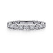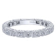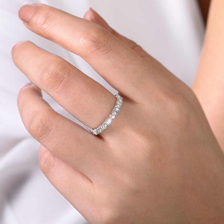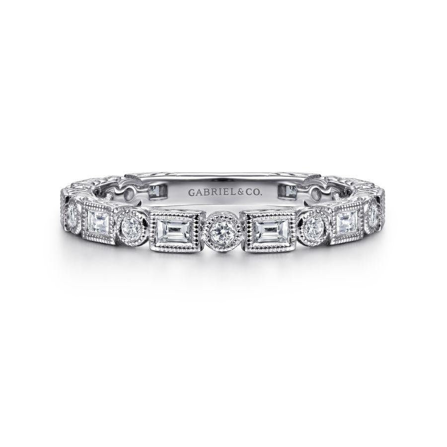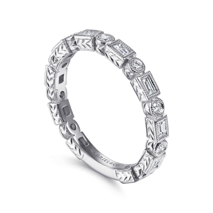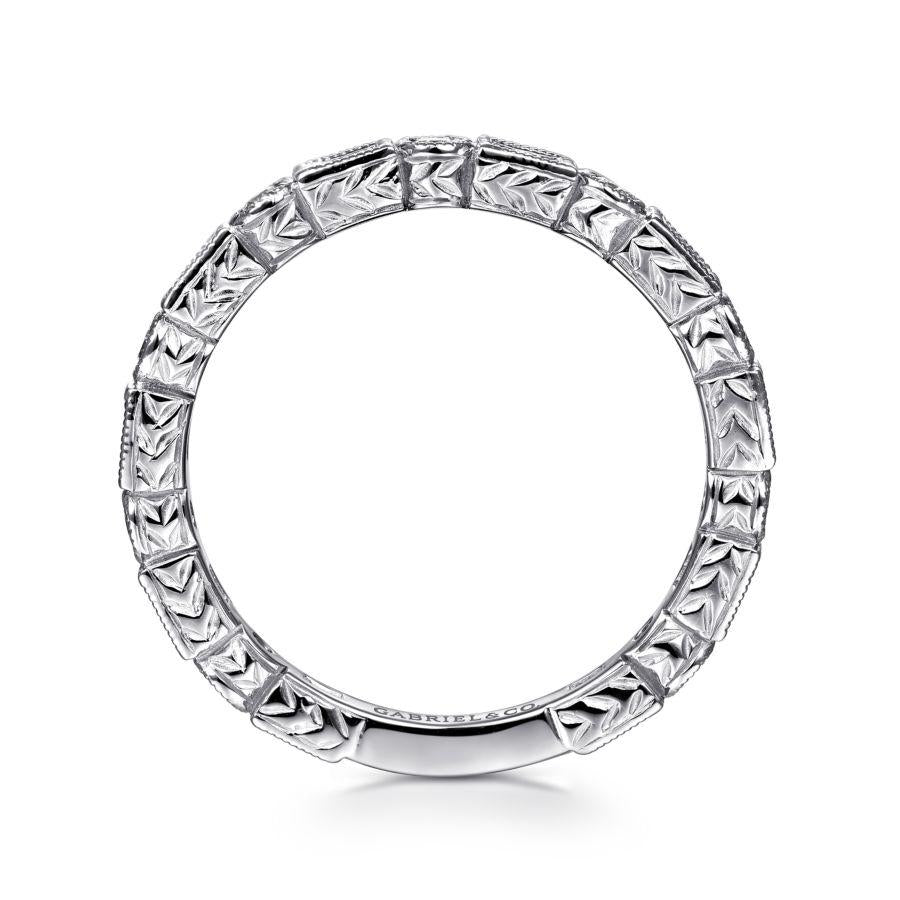 Alternating round and rectangular shapes are studded with 0.50cts of resplendent diamonds in this 14K white gold stackable ring that draws the eye with a masterfully engraved design around the band.